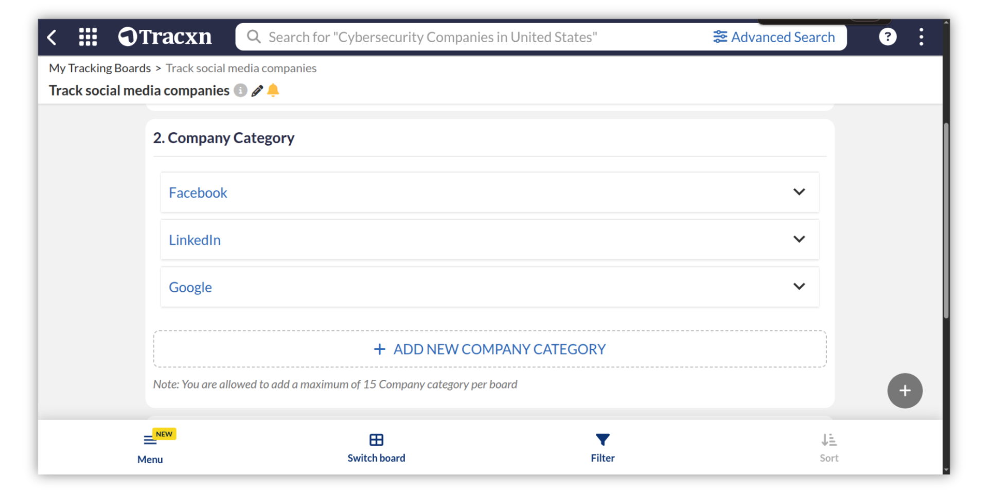 In the Add Company Category, update the board Company Category Name and select one or more Companies. You can also add multiple Company Categories in the tracking board by clicking on the "Add New Company Category" option and update the details as mentioned in the previous step. Note that you are allowed to add a maximum of 15 company categories per board.