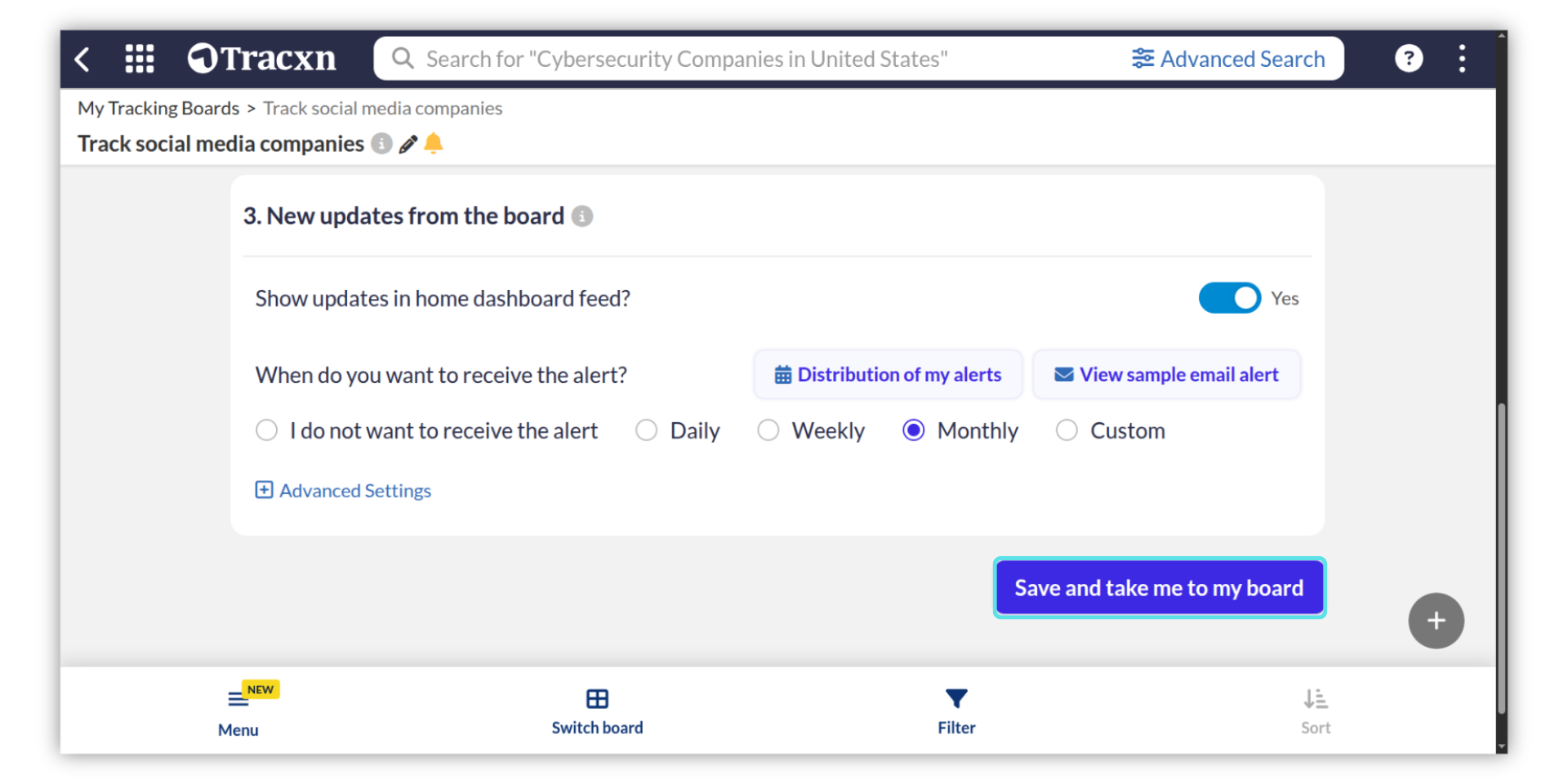 You can set the view option of Track Peer Companies updates feed on the homepage dashboard. You can also configure alerts for the desired frequency and then Click on "Save and take me to my board" to effect these changes.