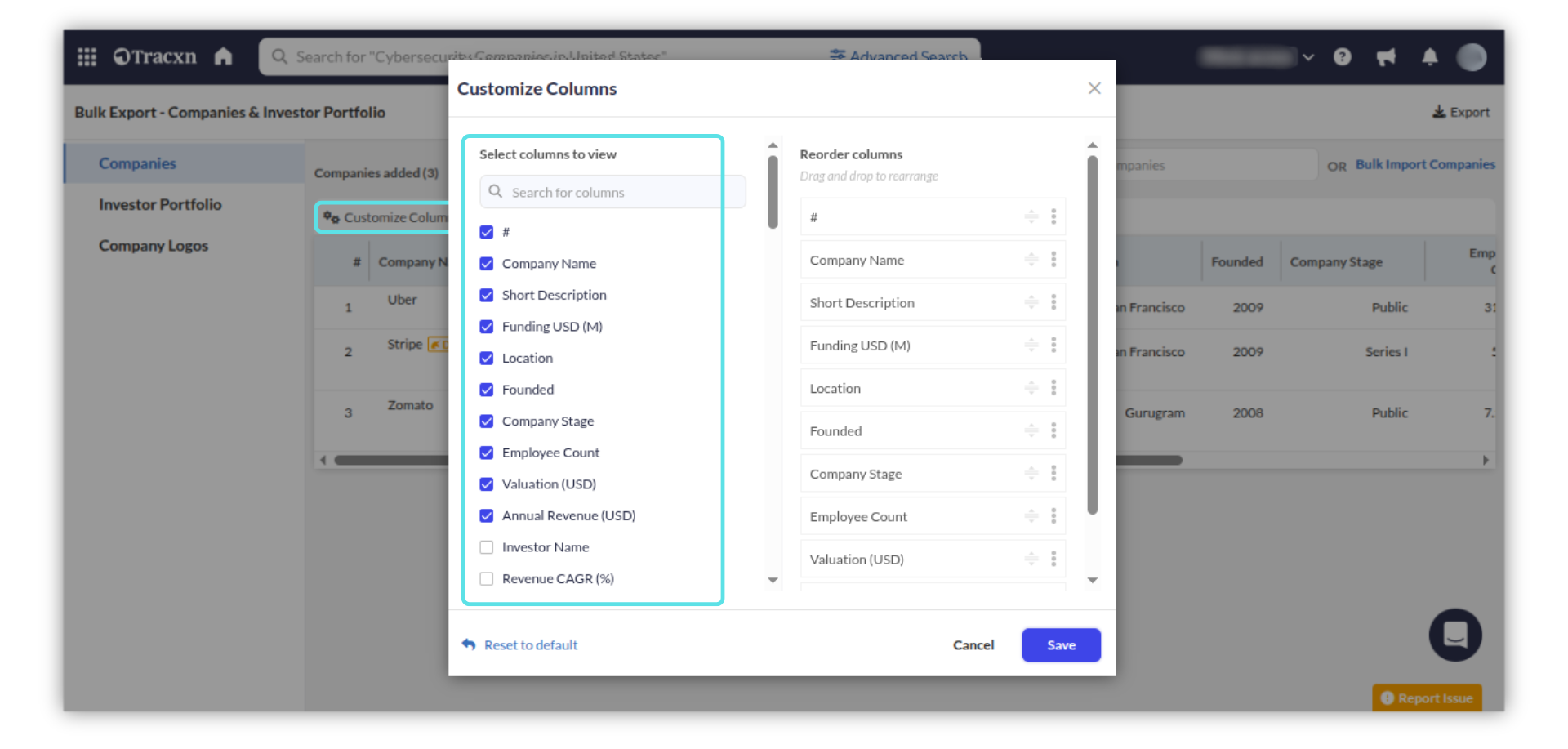 Investor Portfolio- It enables you to download the entire portfolio of a selected list of investors. The export will include detailed portfolio data like company profiles, funding information, etc.