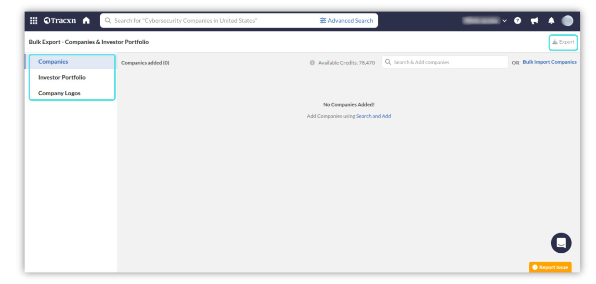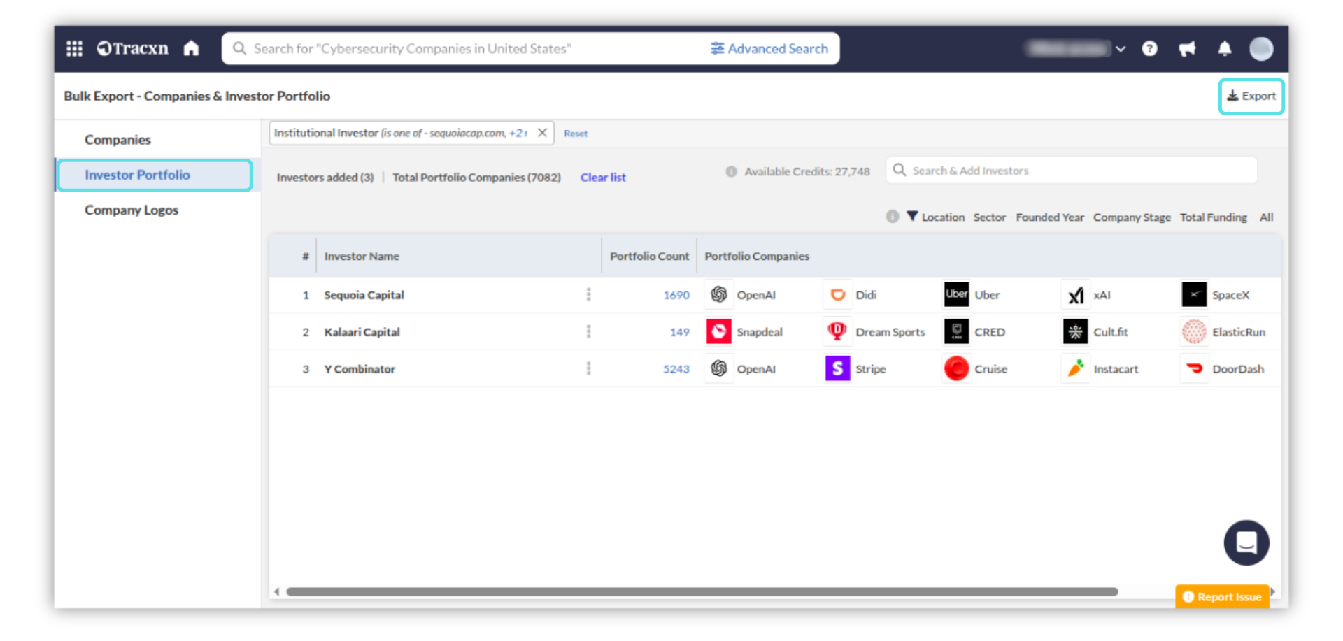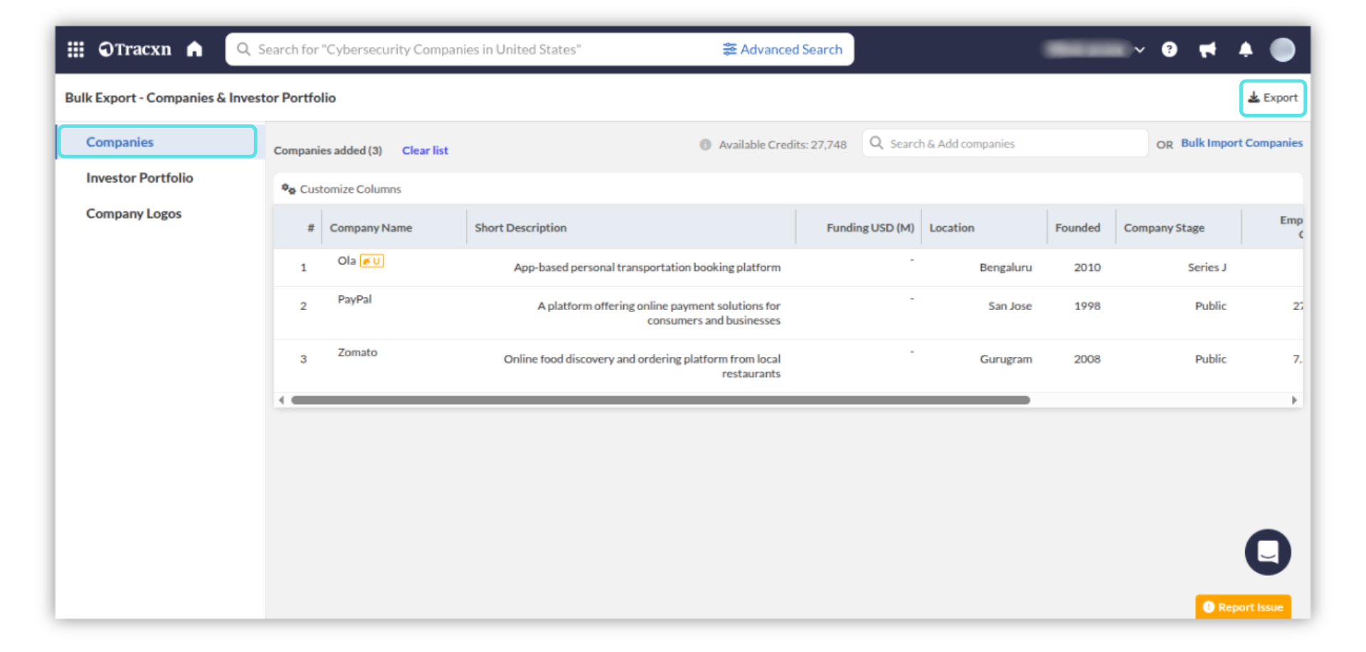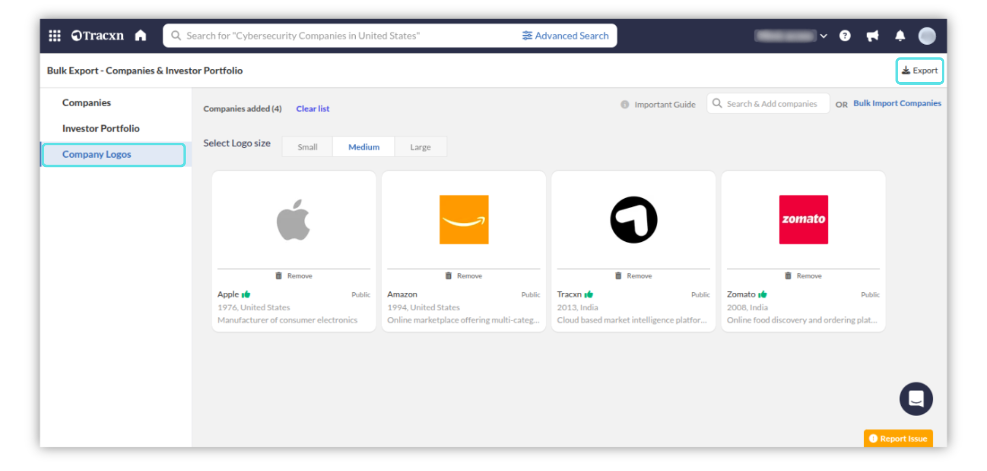The "Bulk Export" feature allows you to download Company Details, Investor Portfolios, and Company Logos for your analysis