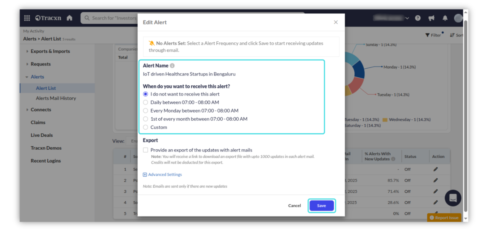 To view all alerts set up across the Tracxn platform: