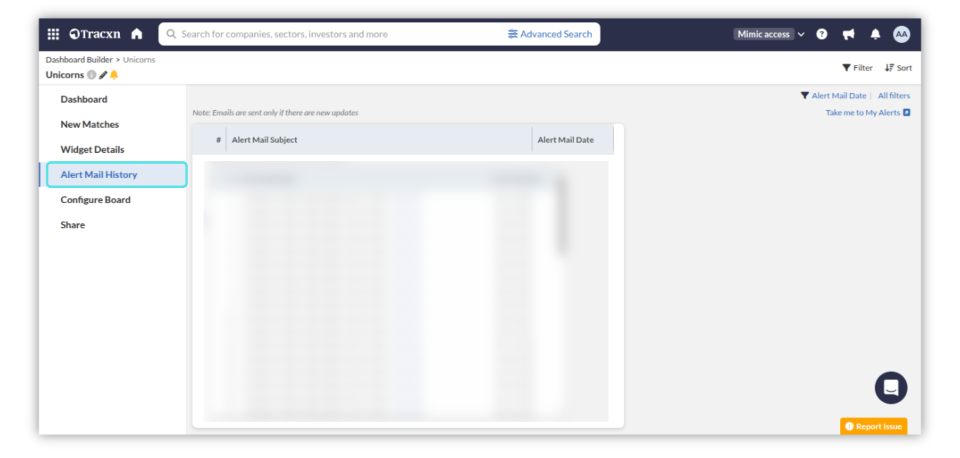 The Alerts Mail History tab under the My Alerts page lets you view the history of all the 'Alert' mails sent to your inbox.