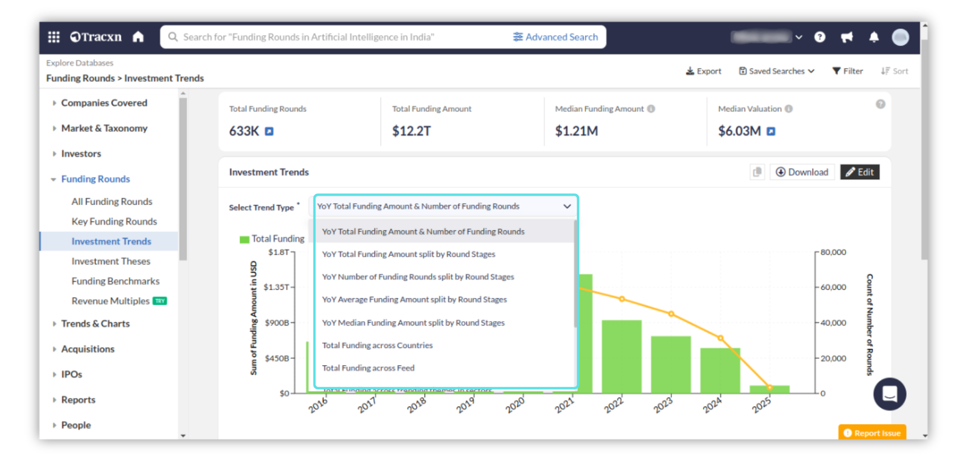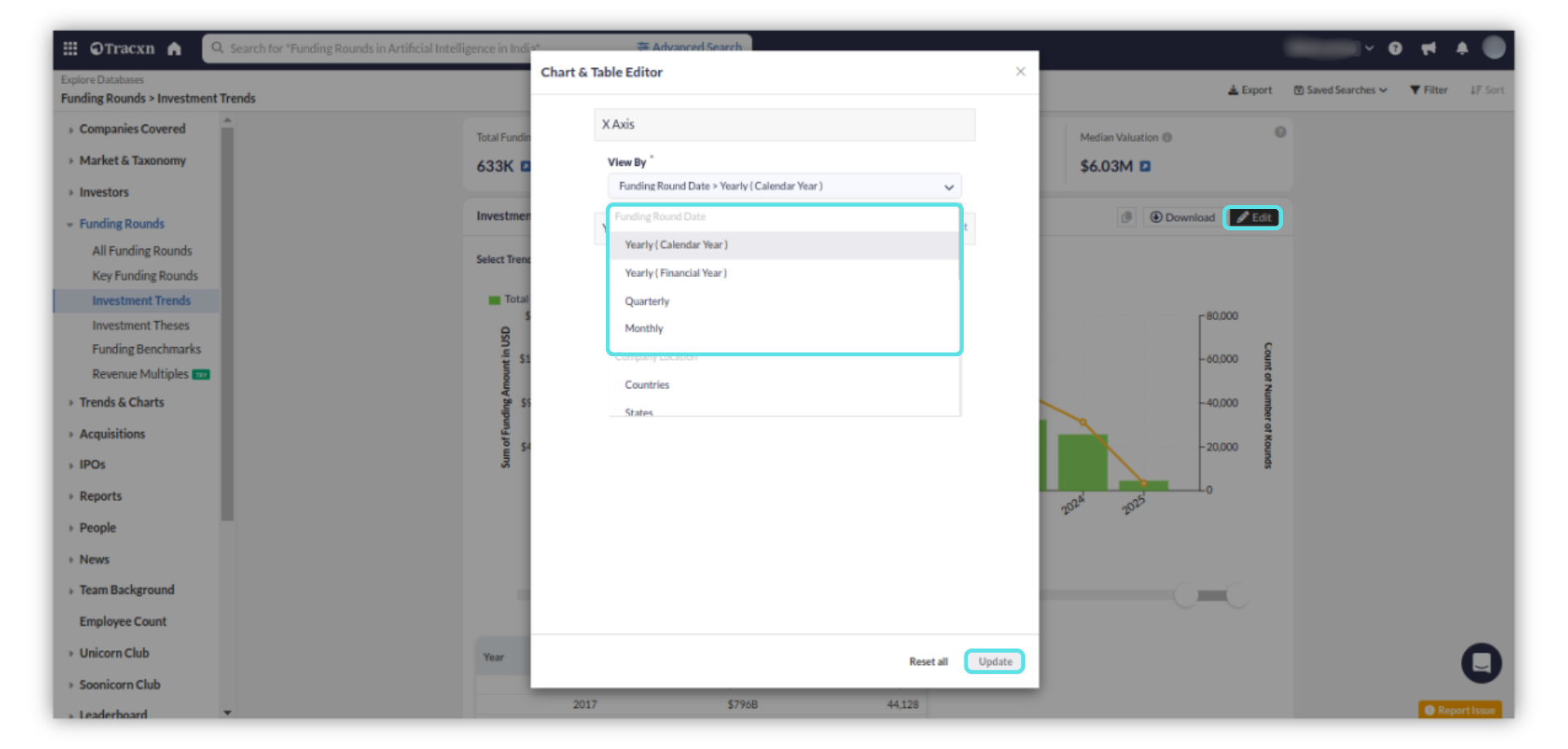 You can also view the Investment Trends in the areas of interest using multiple filters based on geography, sector, funding, and other performance metrics.