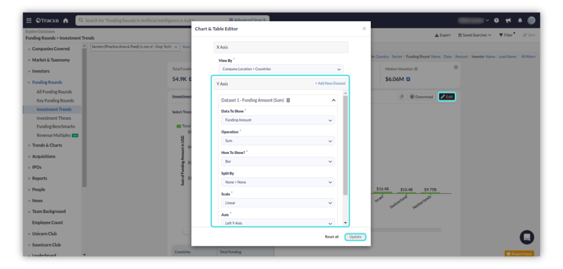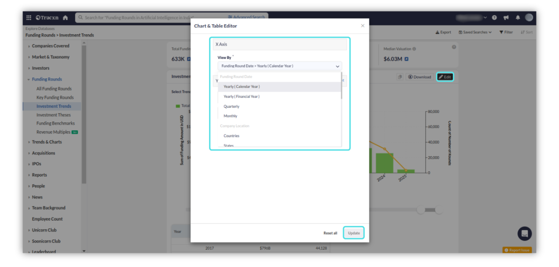 X Axis: Allows you to group the investments by clicking on 'Edit' button and selecting any of the 'View By' drop-downs - Funding Round Date, Company Location, Company Sectors, Investor's Location, Investor's Sectors as per interest, and then click on Update.