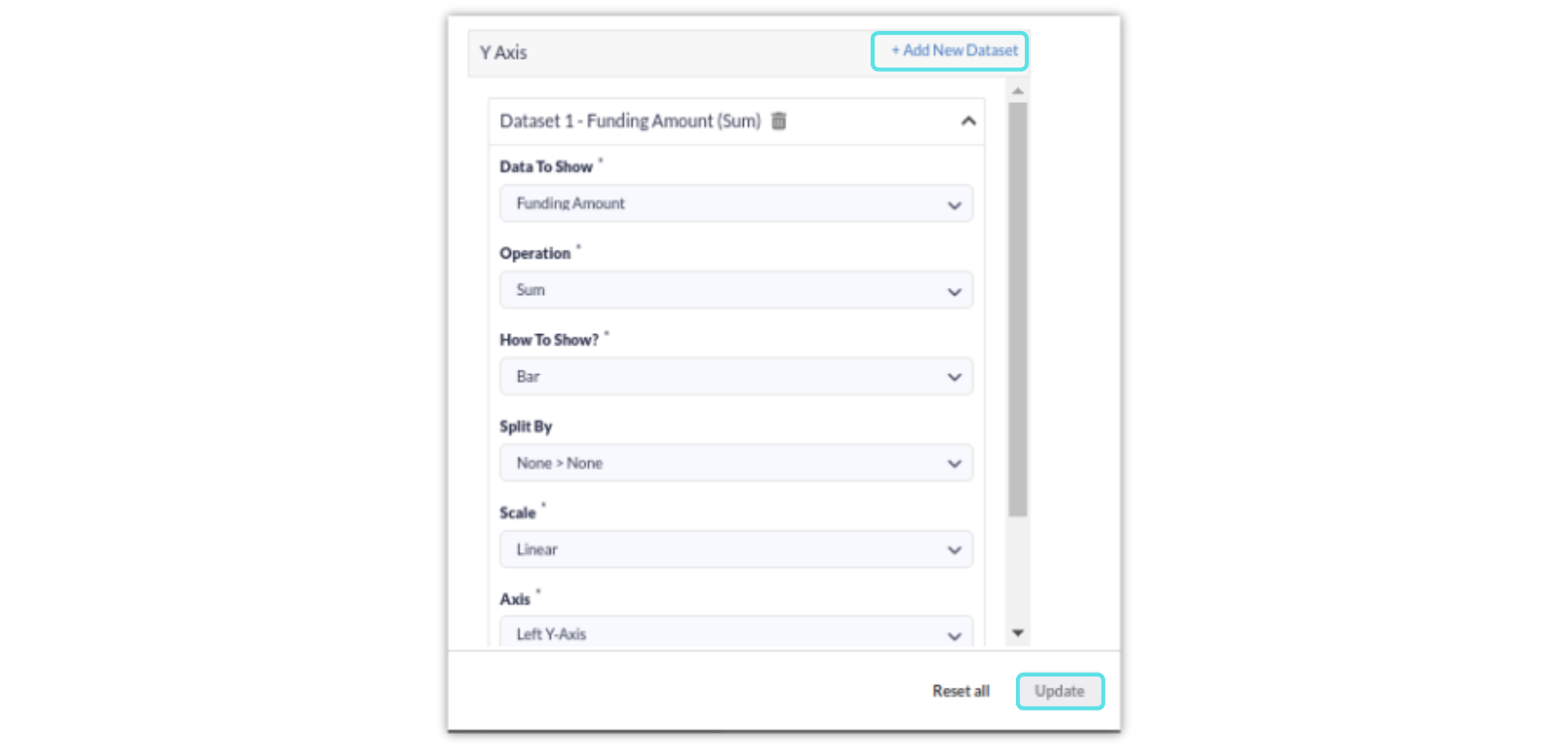 Y Axis: Allows you to customize the data in the different datasets. Select any of the below options and click on Update.