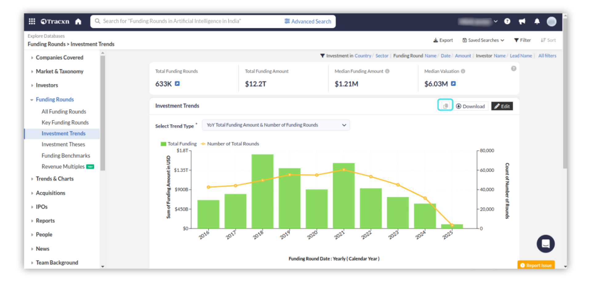 The underlying data behind the Investment Trend view can be accessed from the Tabular View option.You can view the table below the chart You can copy it by clicking the 'Copy' button.