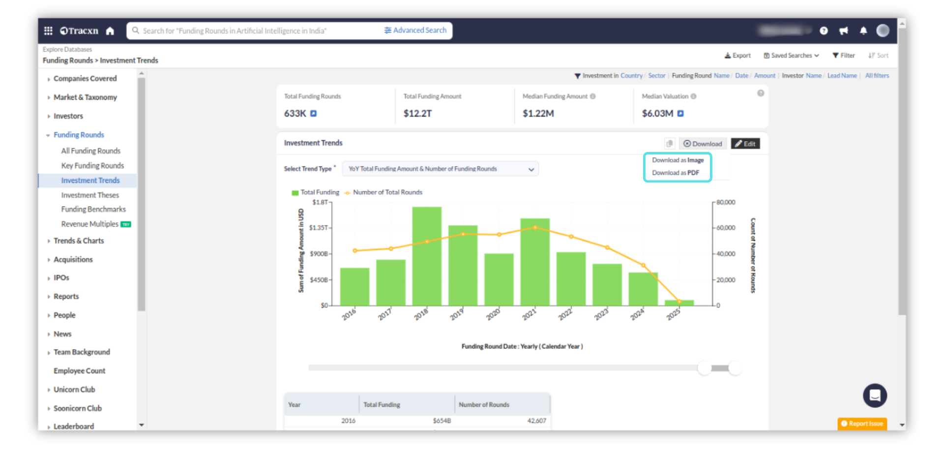 You can download only the Chart view of the Investment Trends by clicking on the "Download" option available on the Investment Trends page.