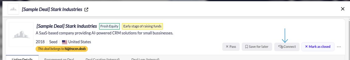 To indicate your interest in a deal, click on the “Connect” button. This will notify the deal owner that you are interested in their deal.
