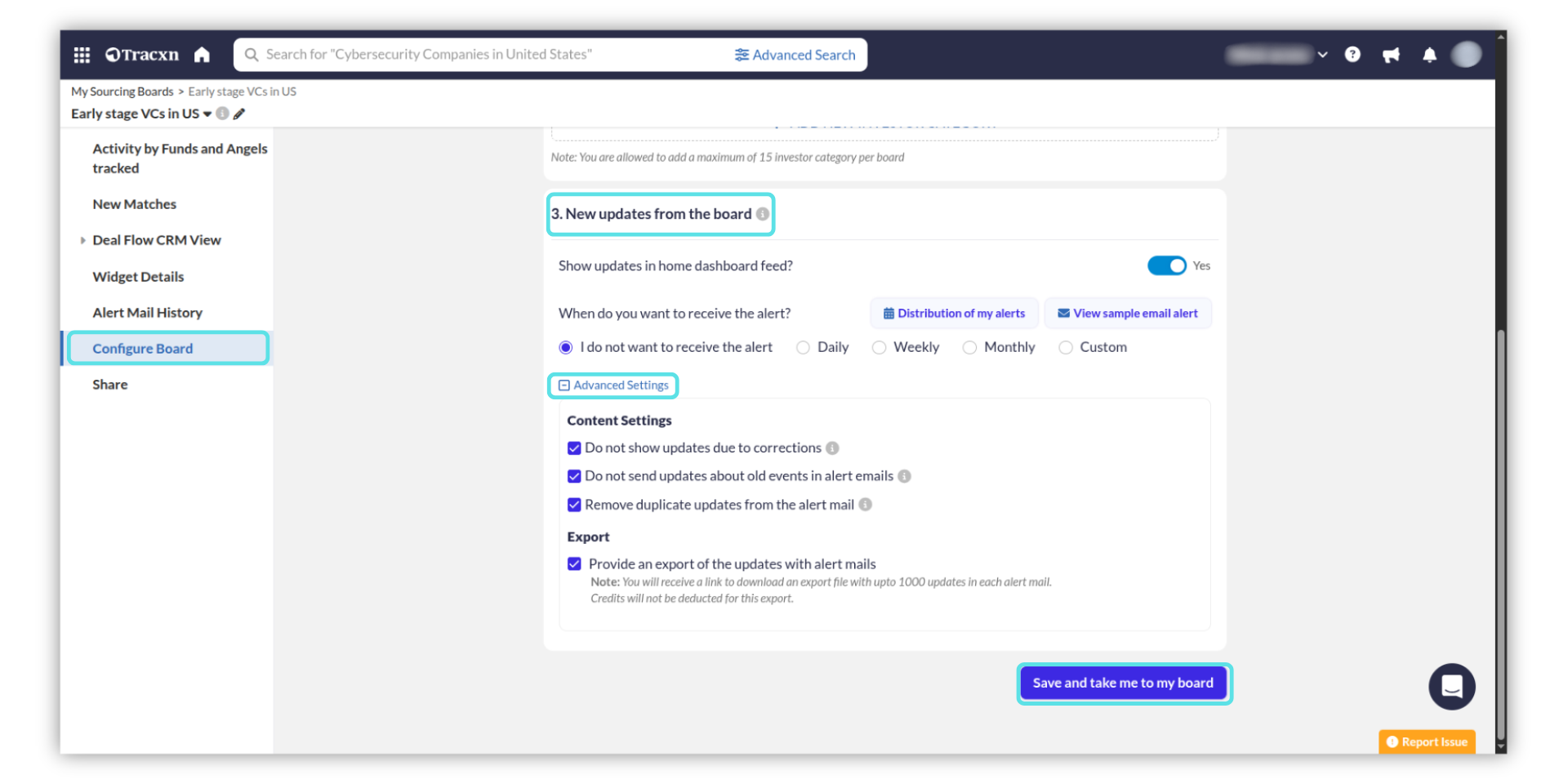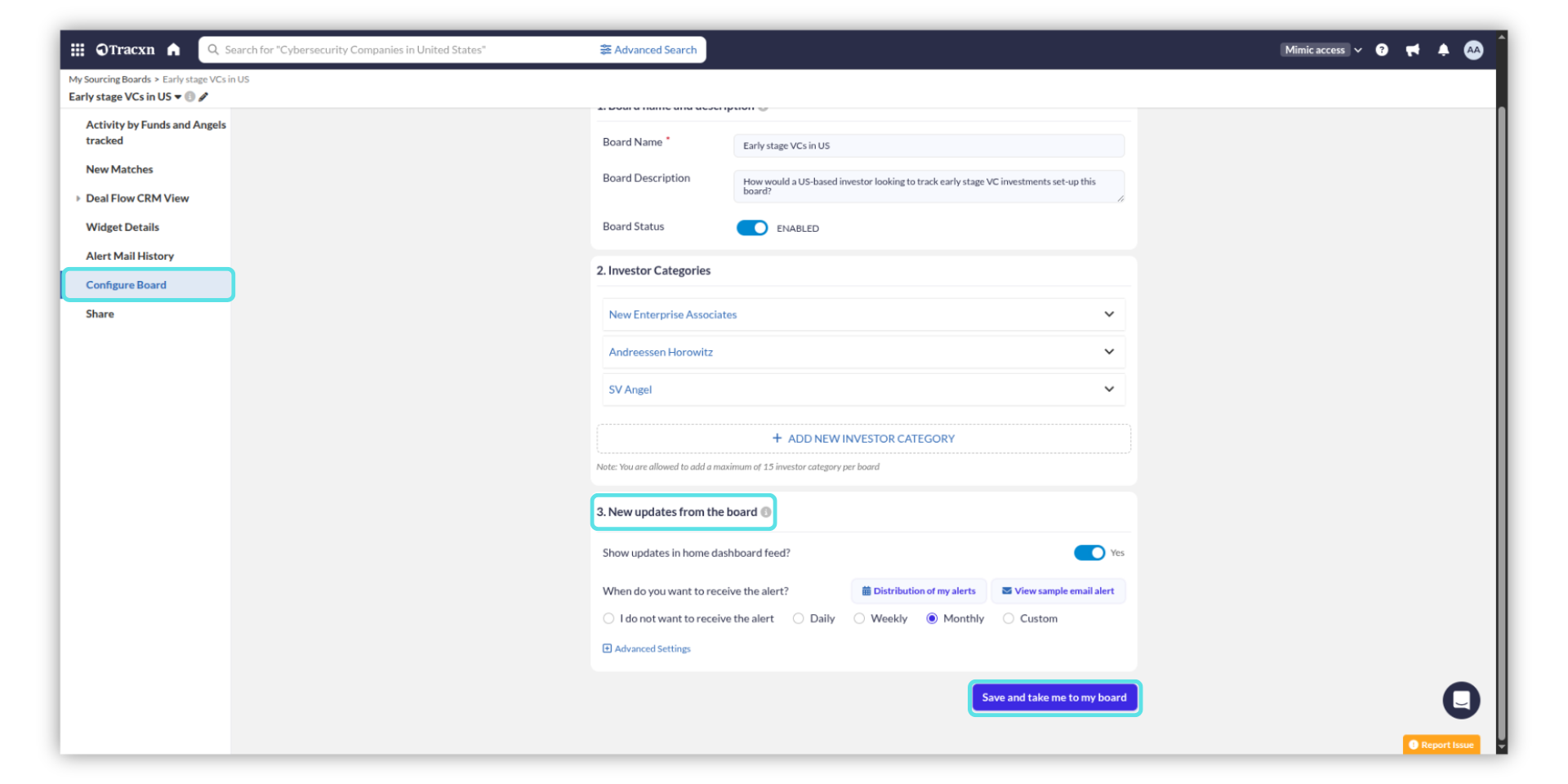 Under the “New updates from the board” section which is usually the last step, configure the alert based on your desired frequency (Daily, Weekly, or, Monthly) as shown below, and then click on the "Save and take me to my board" button once the board is set up.
