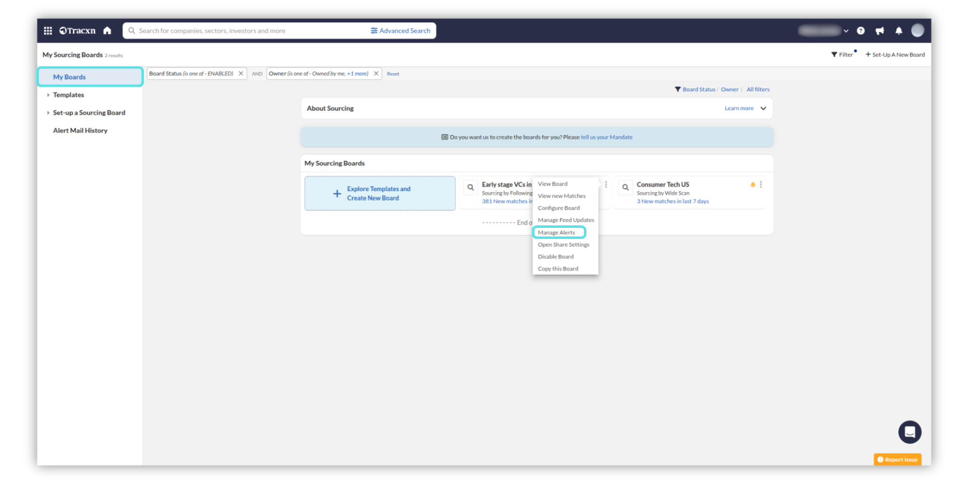 Click on the 3 dots of the desired board and click on the "Manage Alerts" option. This will redirect you to the “Configure Board” page of the sourcing board.
