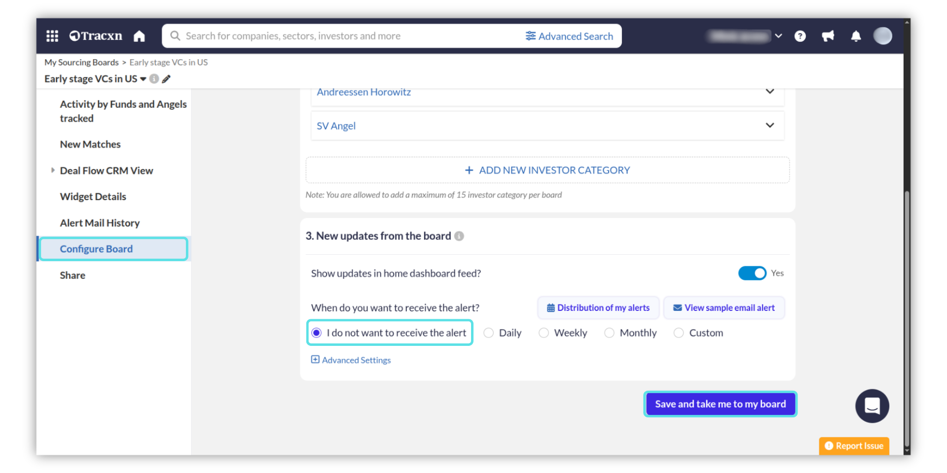 Go to the "New updates from the board" section. Select the "I do not want to receive the alert" radio button and click on the "Save and Take me to my Board" button to save the changes.
