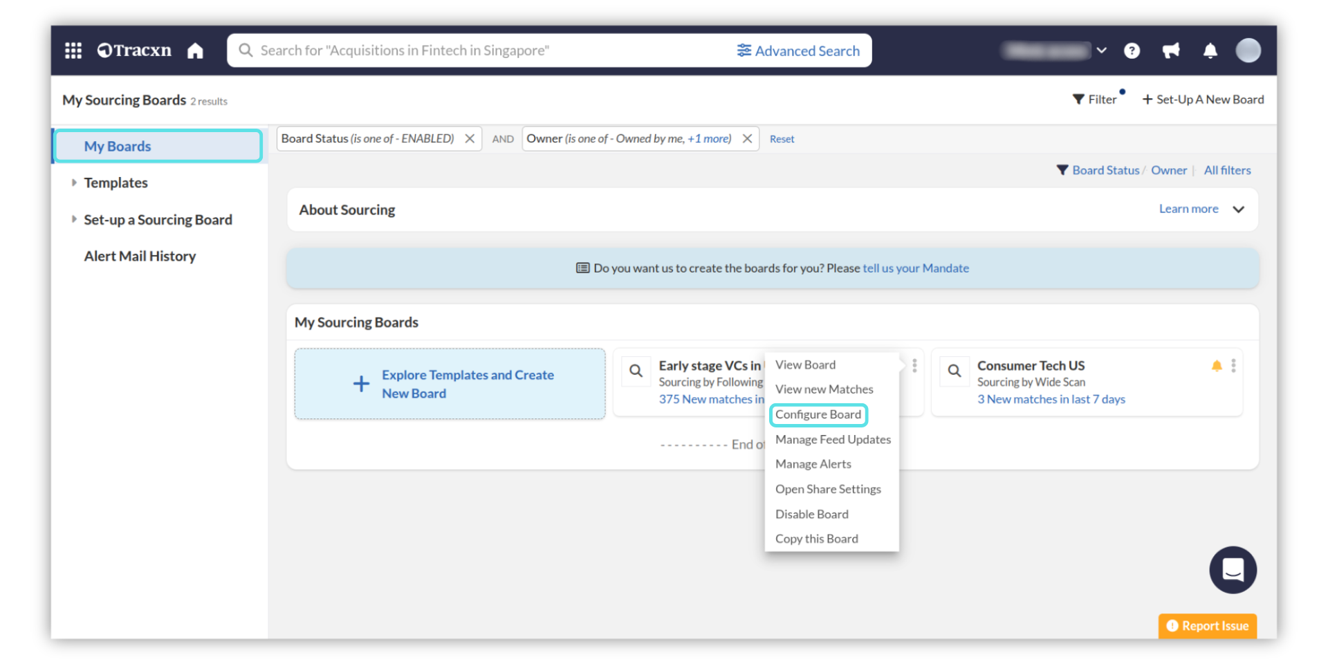 Locate the desired board and click on the three dots in the top right corner. Select the "Configure Board" option from the dropdown menu. This will redirect you to the "Configure Board" page for that sourcing board.
