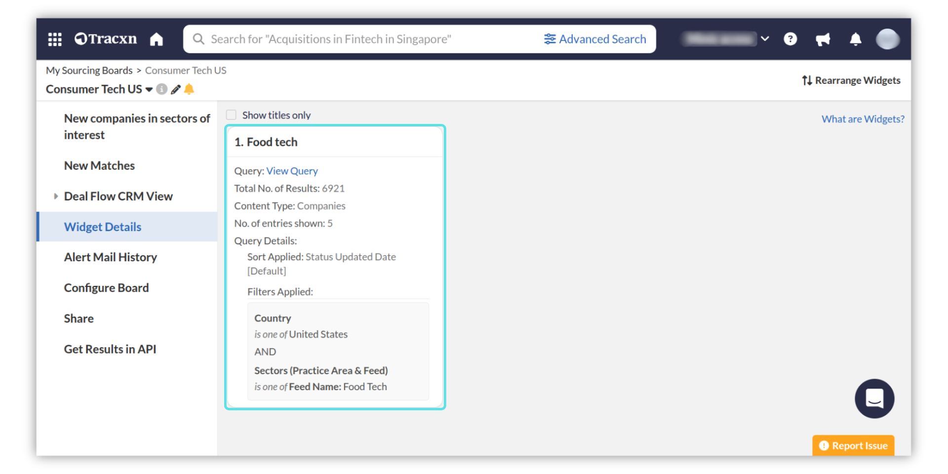The "Widget Details" page gives you the list of all available widgets in a board along with the search query behind the widget. You can view the details of a widget such as query details, no. of results, etc.