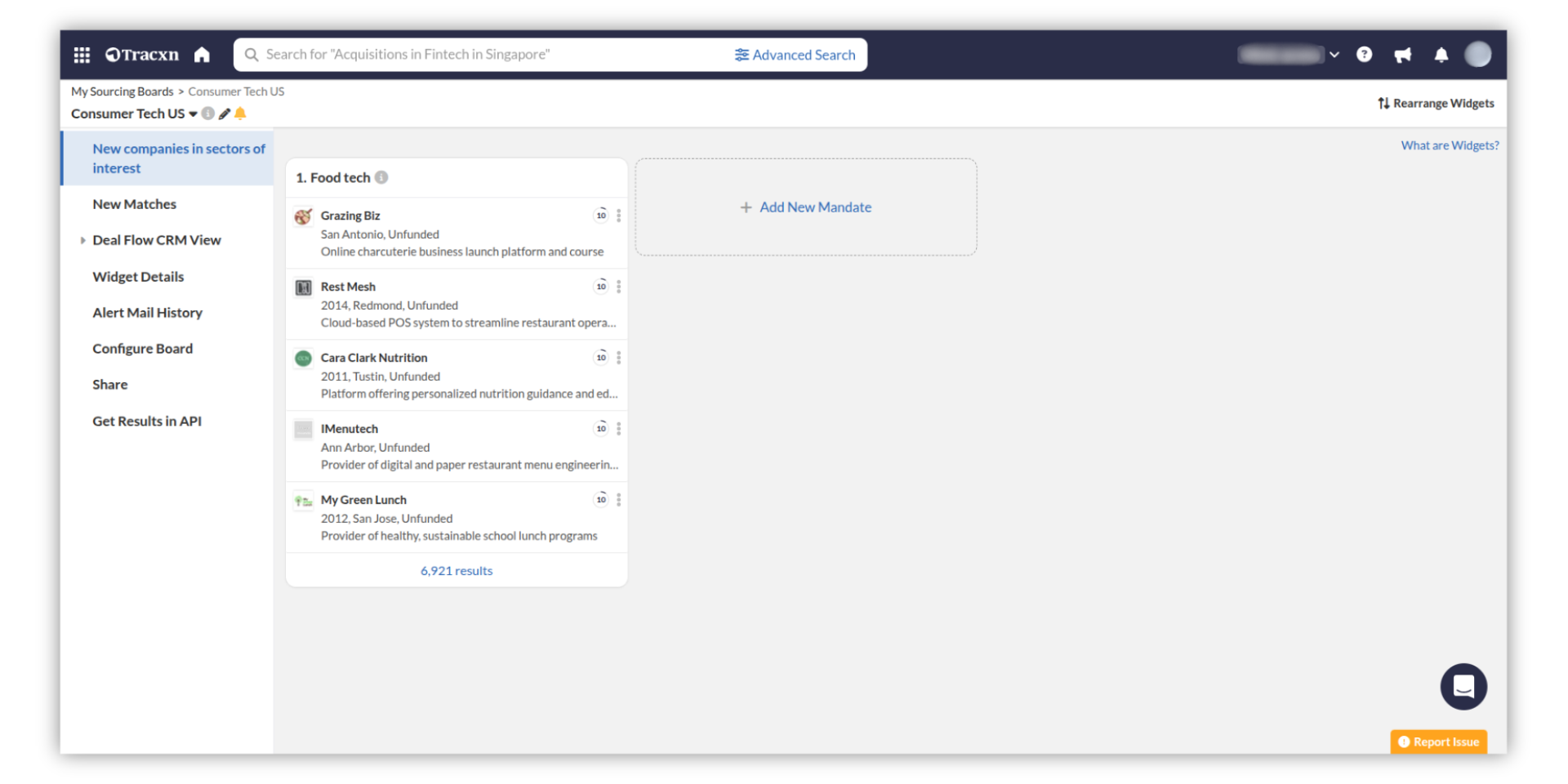 Widget page of the sourcing board opens by default. Each widget gives you a list of companies that match your investment mandate