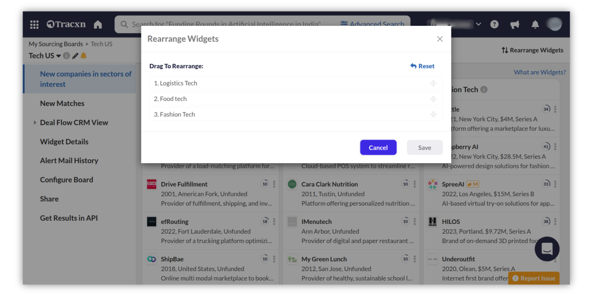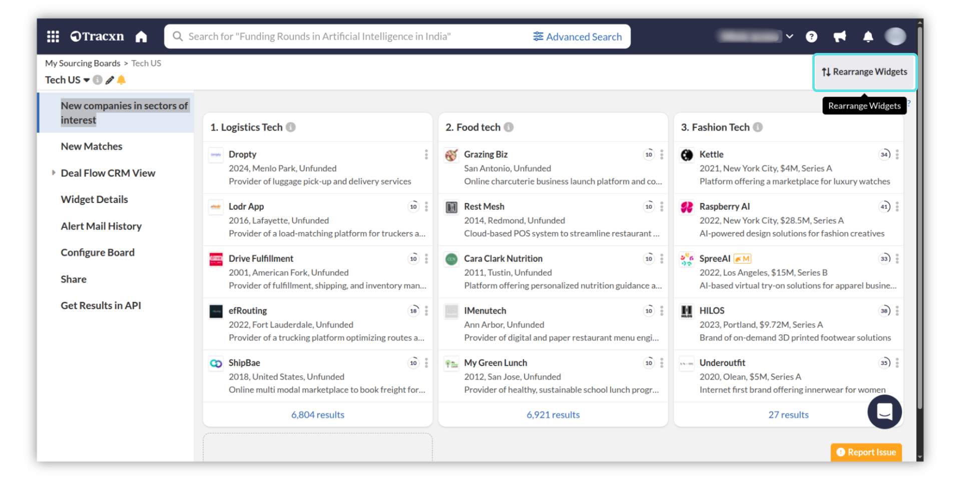 In the “New companies in sectors of interest” tab or in the “Widget Details” tab, click on the "Rearrange Widgets" option present in the top right corner of the page.