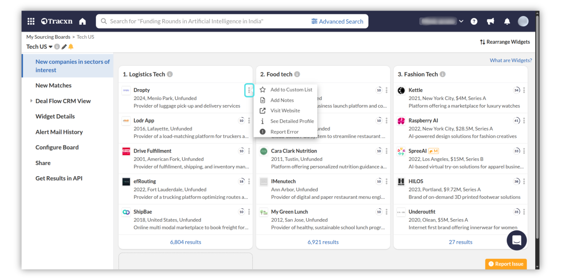 You can add the desired companies in a widget to a custom list by clicking on the "three dots menu" present against each company.