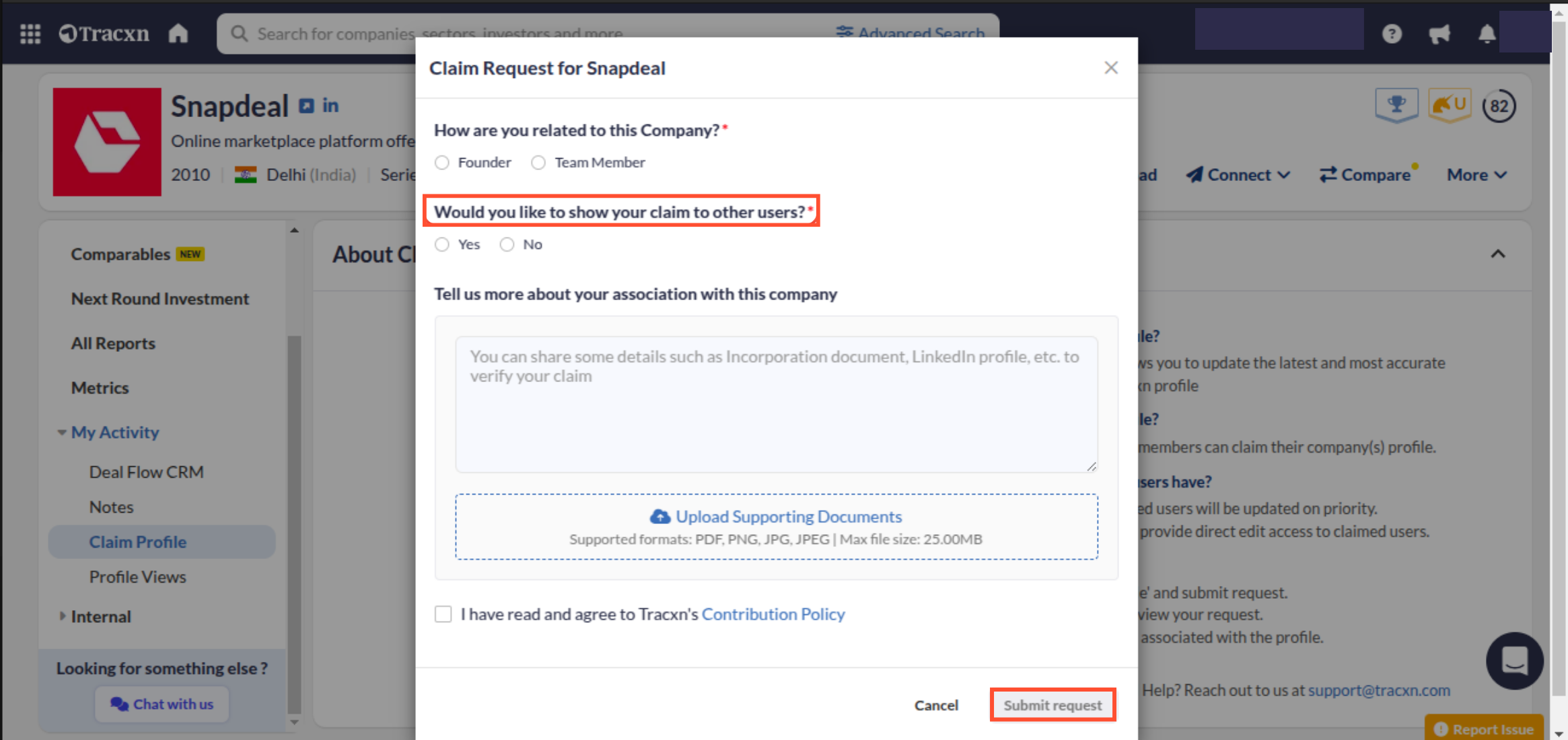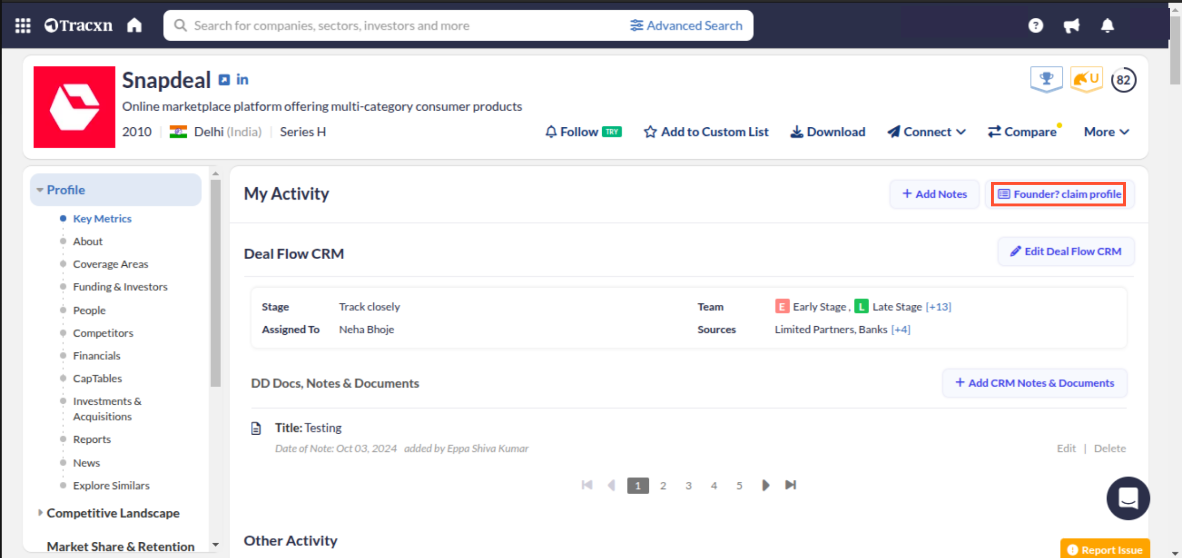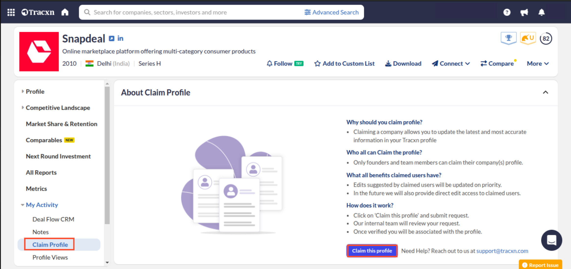 Alternatively, you can click on the Tab that says Founder? Claim Profile on the banner at the top. This will take you to My Activity > Claim Profile tab for the company.