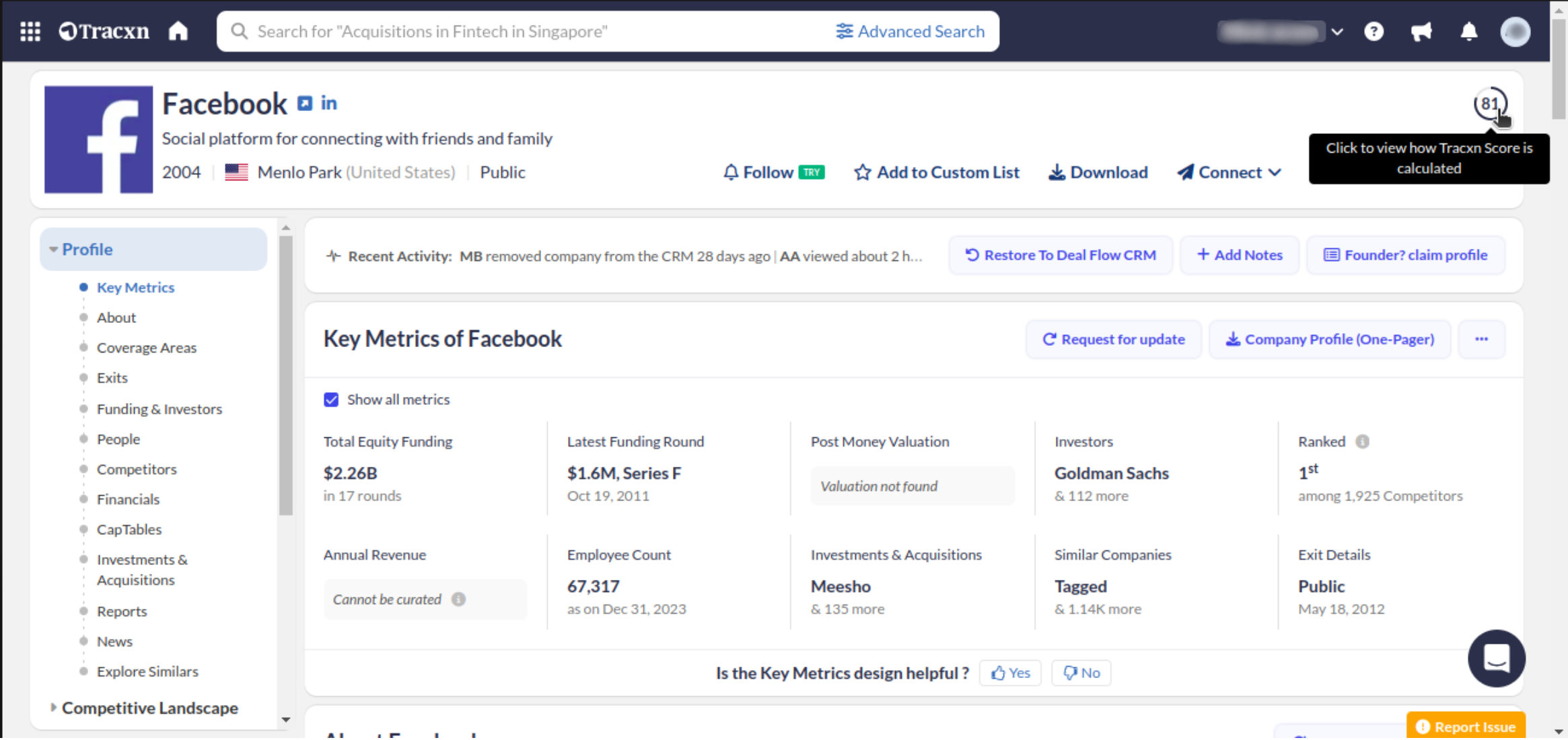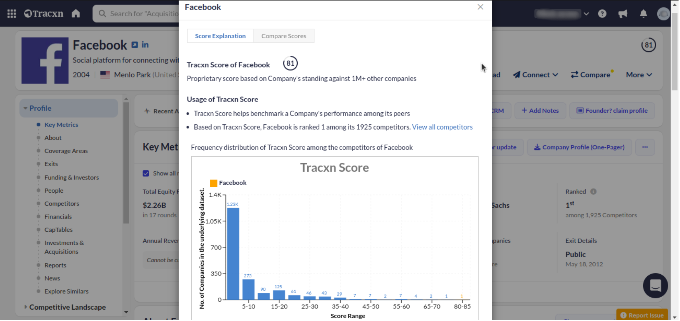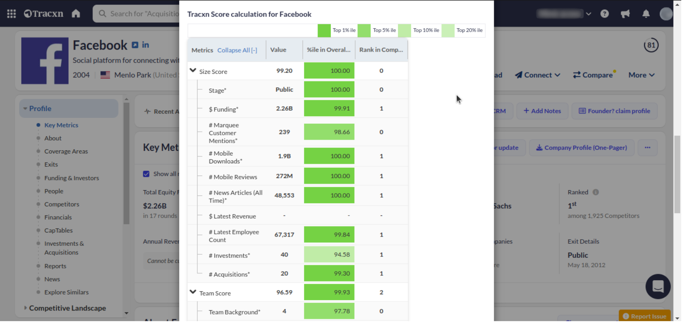Tracxn Score Calculation Example - Facebook is taken as an example to explain Tracxn score here: