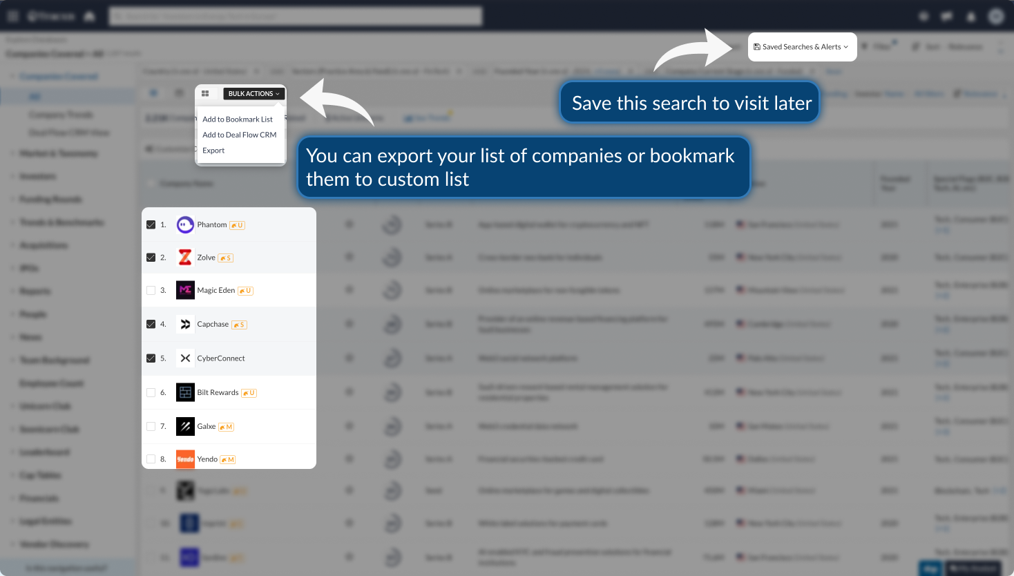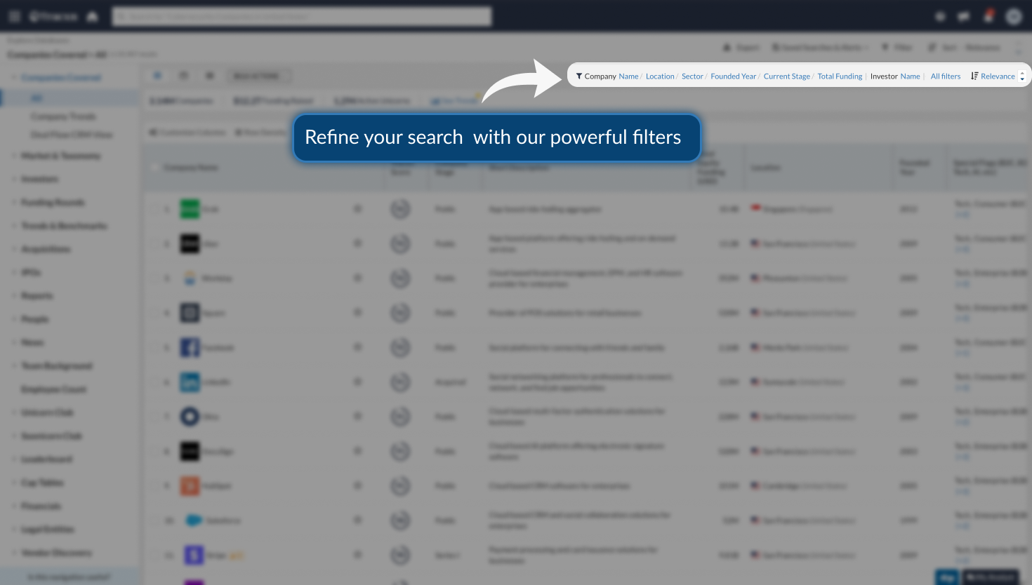 Whether you’re interested in startups in a particular sector, companies founded within a specific timeframe, or businesses at a certain stage of growth, Tracxn offers you a powerful set of filters to slice and dice data and boost your productivity.