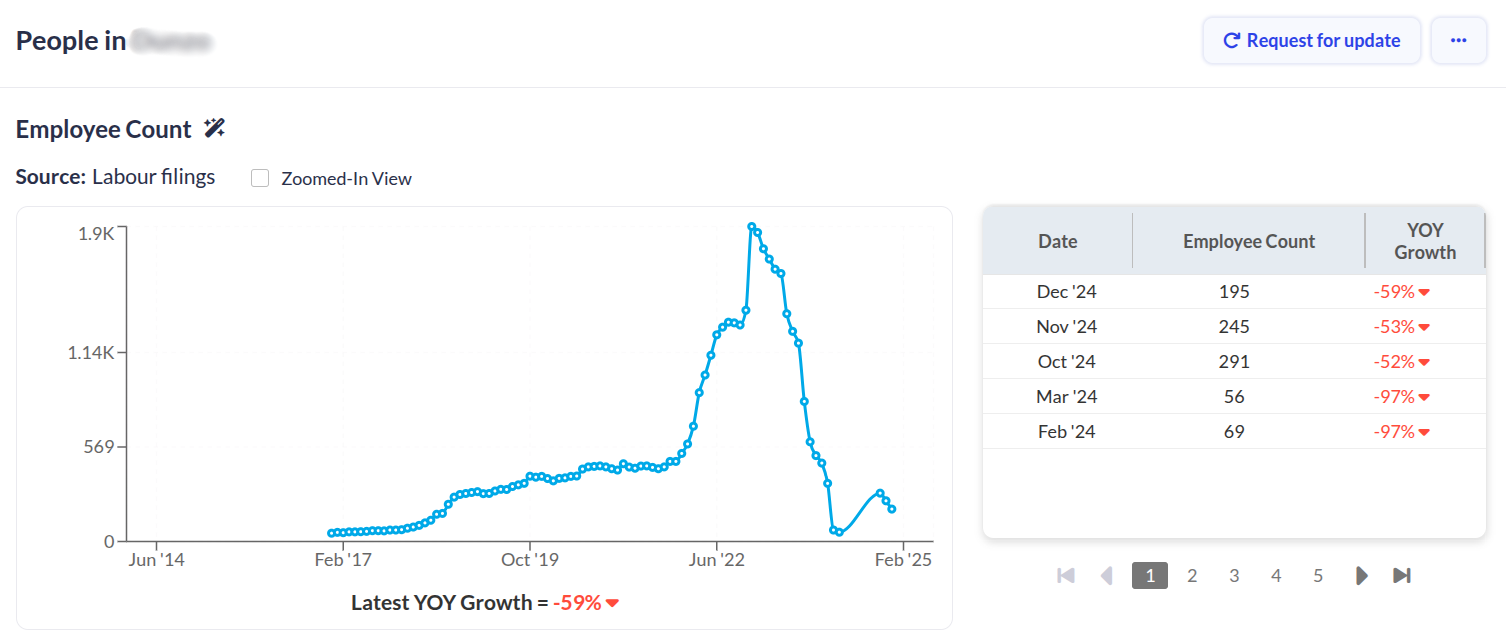 Analyze YoY employee growth with interactive trend lines and uncover insights into stability, expansion, and market positioning of any company of your interest with ease.