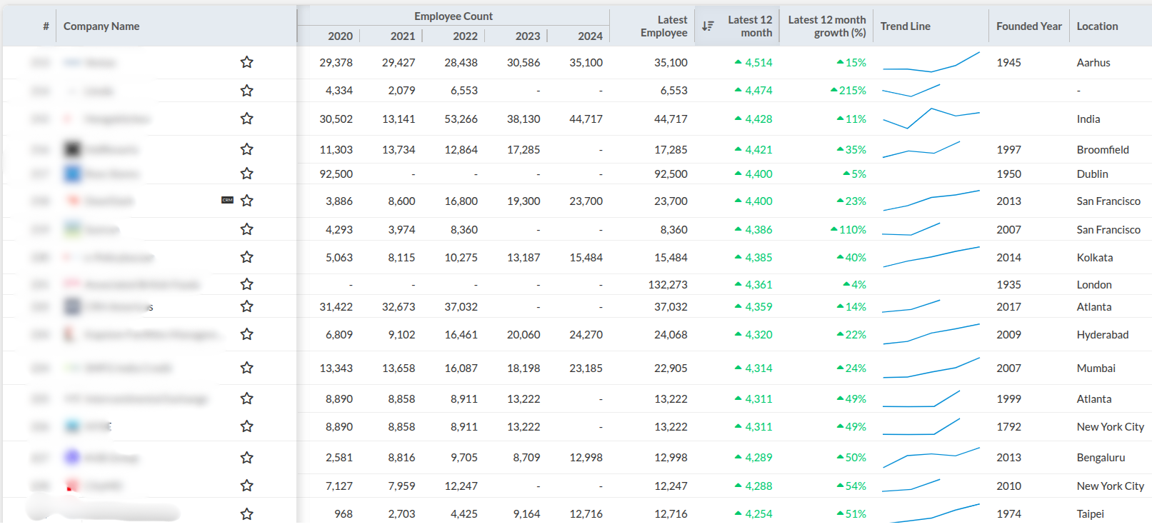 Explore company workforce trends* with unmatched depth. Our employee count database tracks historical trends, latest workforce numbers, and 12-month growth metrics, giving you a clear picture of how a company is scaling.
