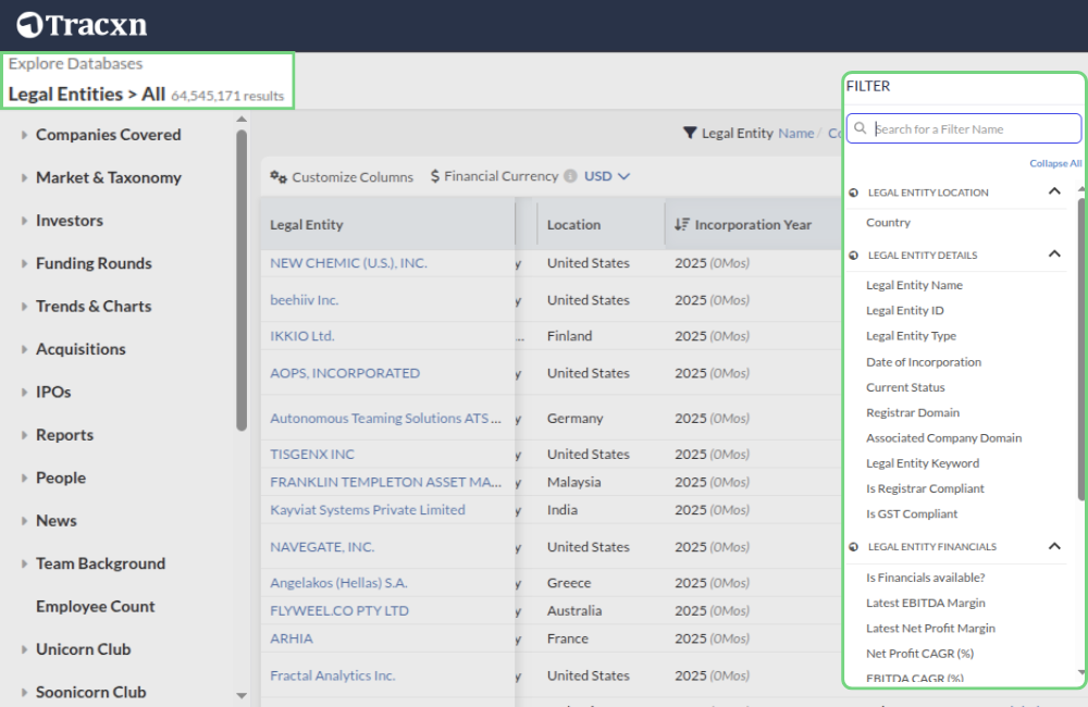 Unlock deeper insights with 30+ filters that allows you tailor your search across legal entity details, financial performance, employee data, capital structure, and more. Sort companies by incorporation date, revenue, profitability, or workforce to quickly identify those that matter most.