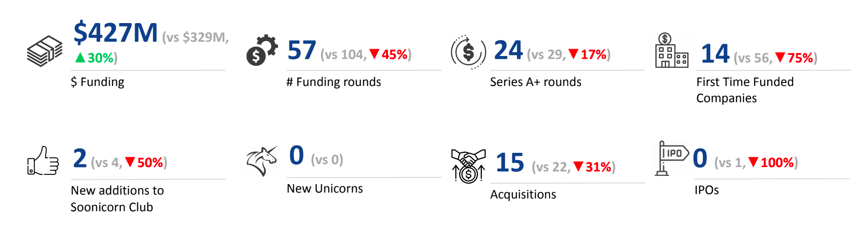 No companies raised funds above $100M in H1 2025. No unicorns were created in H1 2025 and H1 2024. Additionally, no companies went public in H1 2025.