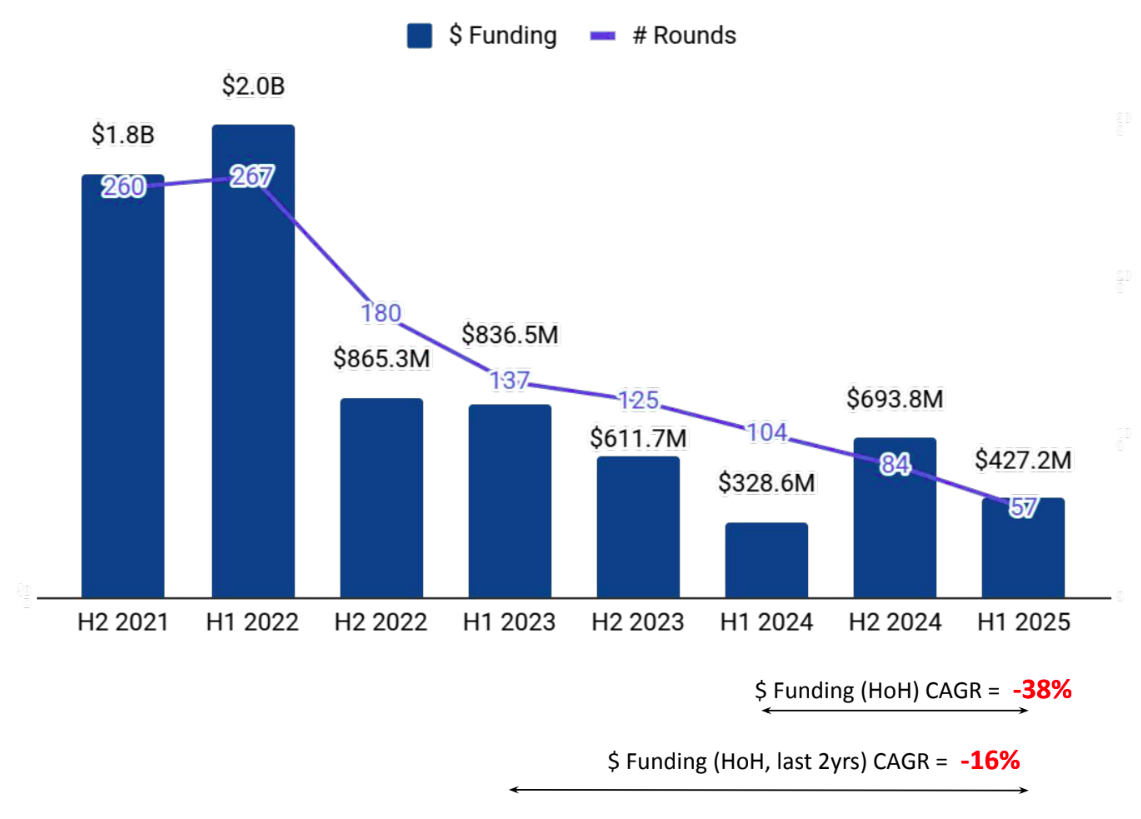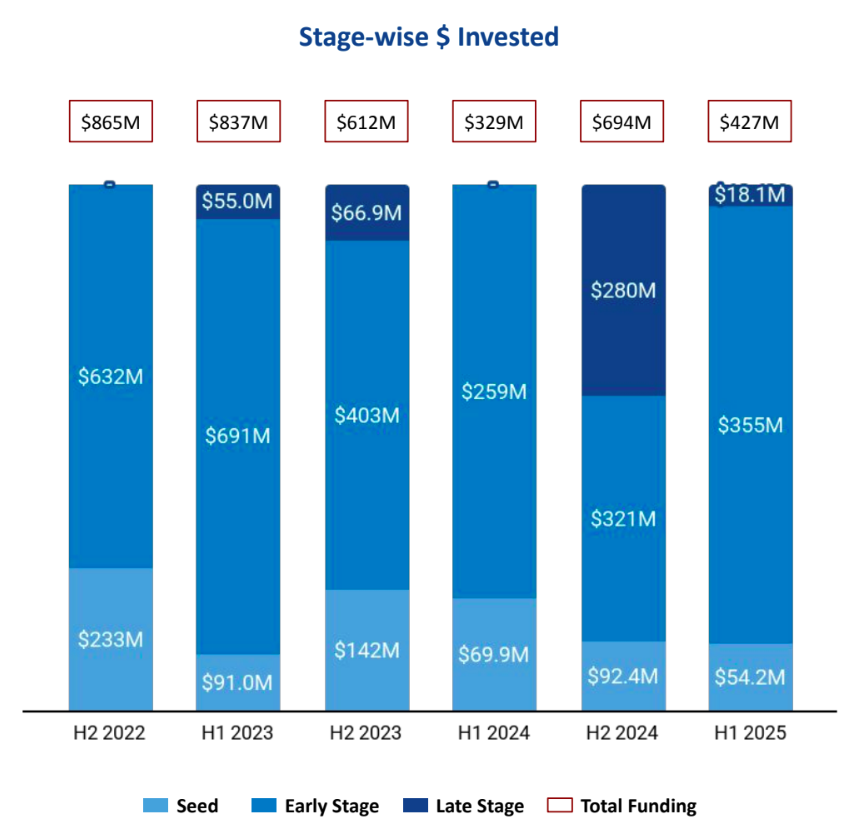 Seed Stage saw a total funding of $54.2M in H1 2025, a drop of 41% compared to $92.4M raised in H2 2024, and a drop of 22% compared to $69.9M raised in H1 2024. Early Stage saw a total funding of $355M in H1 2025, an increase of 11% compared to $321M raised in H2 2024, and an increase of 37% compared to $259M raised in H1 2024. Late Stage witnessed a total funding of $18.1M in H1 2025, a drop of 94% compared to $280M raised in H2 2024, and no funding was seen in H1 2024.