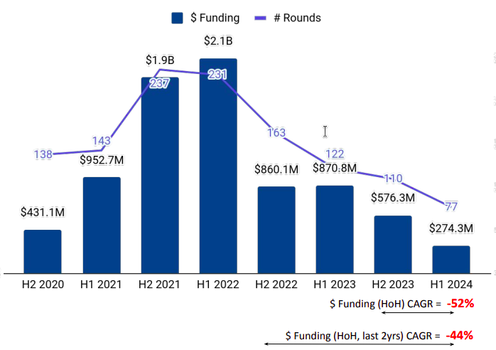 Seed-stage funding saw a total funding of $56.1 million in H1 2024, a decline of 14.9% from $65.9 million raised in the first half of 2023. Early-stage funding stood at $218 million in H1 2024, a plummet of 70.9% from the $750 million raised in H1 2023.