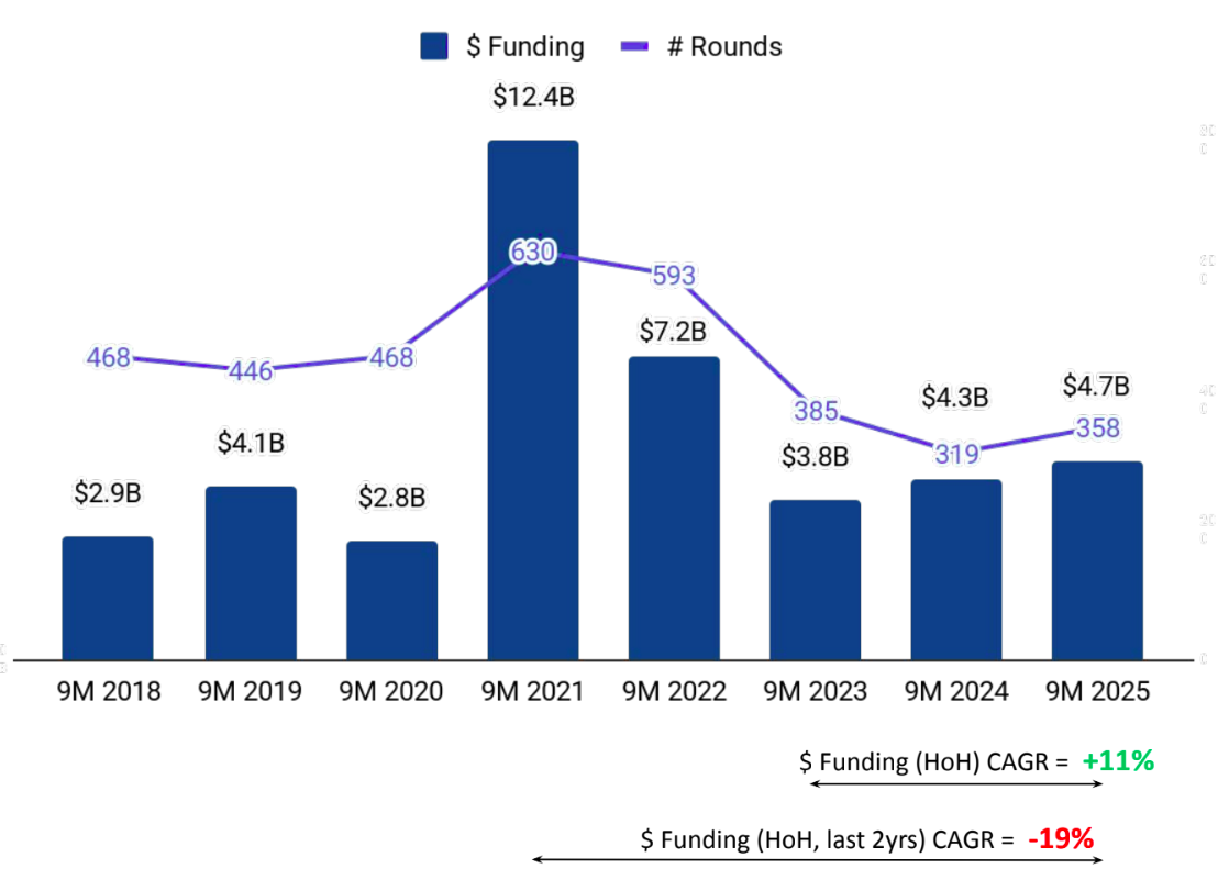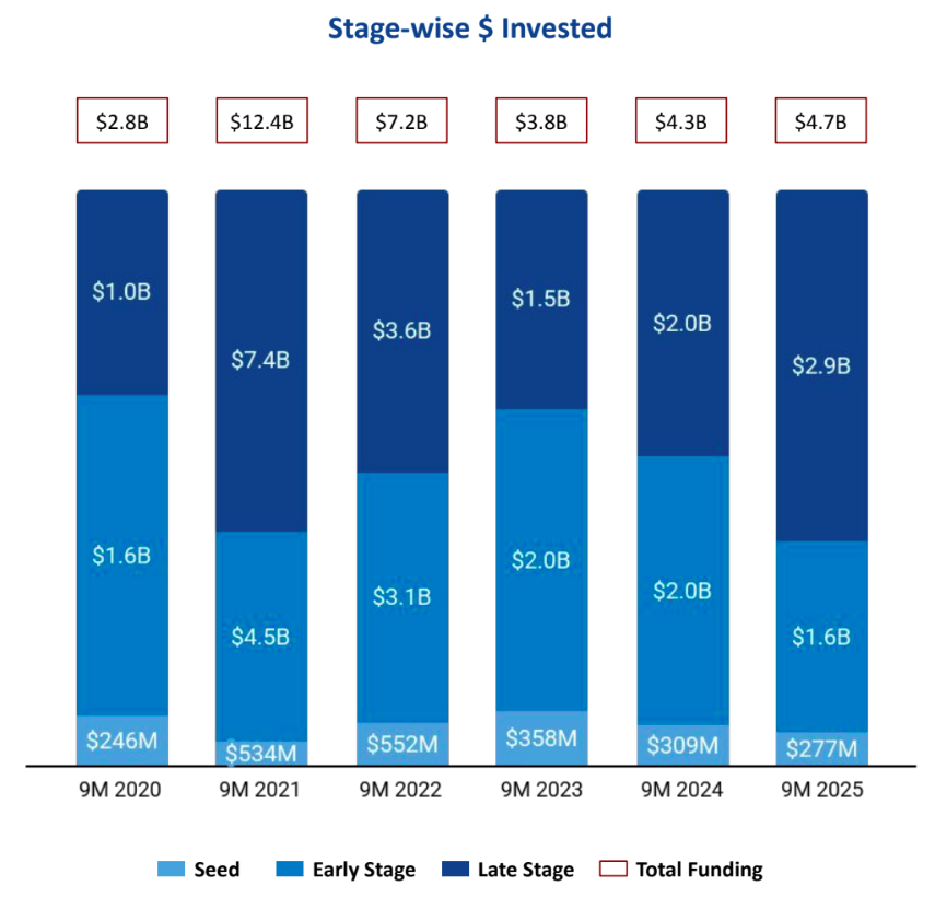 Canada’s tech sector raised a total of $4.7B in 9M 2025, marking an 11% increase compared to $4.3B in 9M 2024 and a 25% rise from $3.8B in 9M 2023. The growth was primarily fueled by robust late-stage investment activity, which helped offset declines in early and seed-stage funding.