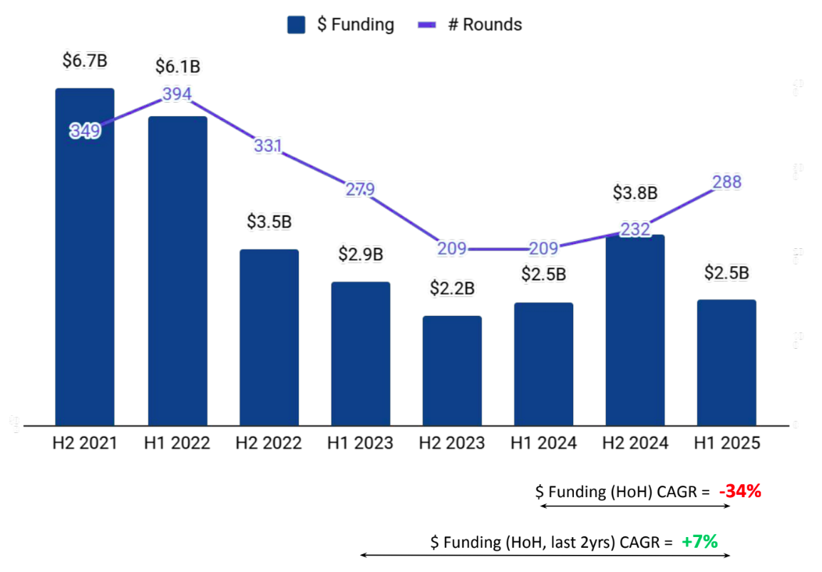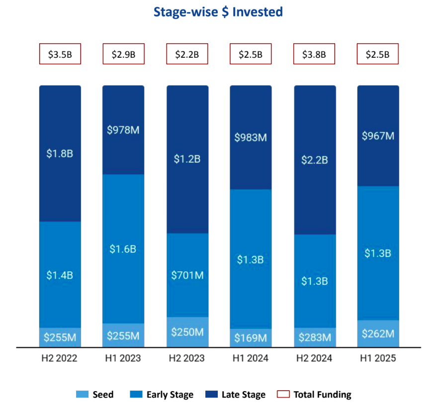 Seed Stage funding totaled $262M in H1 2025, a drop of 8% from $283M in H2 2024, yet a significant 55% increase compared to $169M in H1 2024. Early Stage funding stood at $1.26B, down 5% from $1.34B in H2 2024 and a 3% decrease from $1.3B in H1 2024. Late Stage funding reached $967M in H1 2025, reflecting a substantial 55% drop compared to $2.2B in H2 2024 and a 2% decline from $983M in H1 2024.
