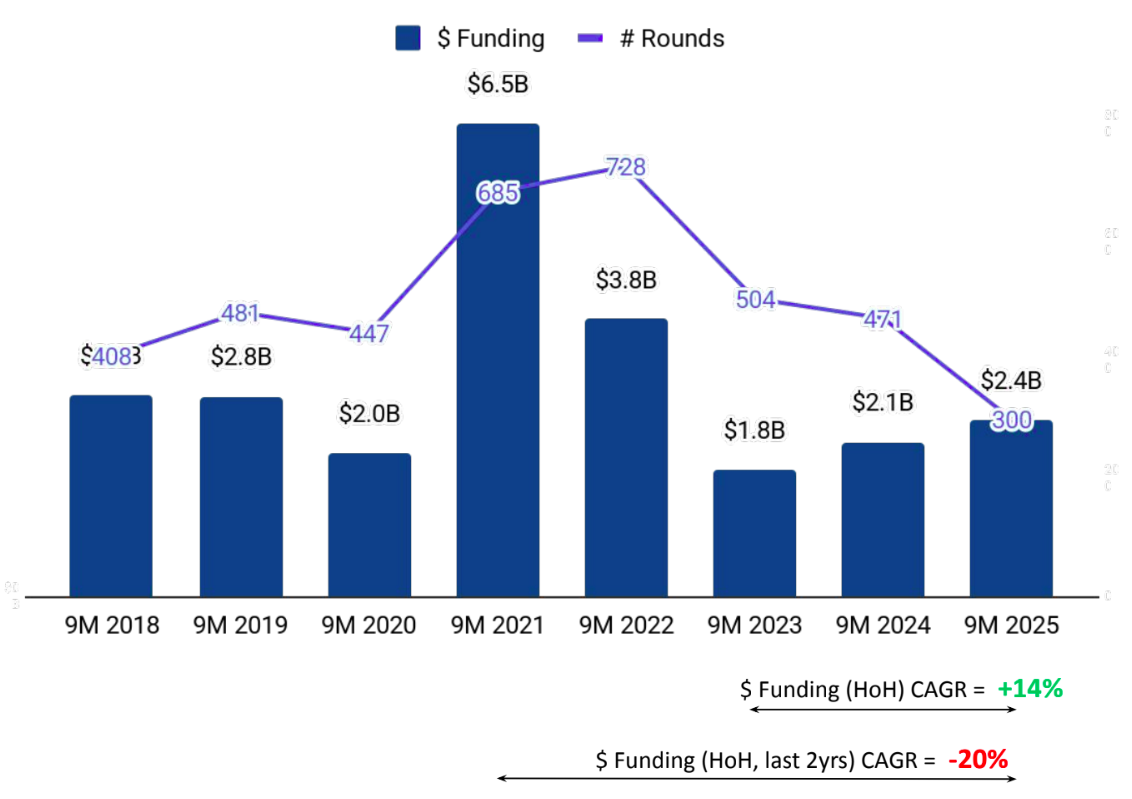 Delhi NCR tech companies raised a total of $2.4B in 9M 2025, a 12% increase compared to $2.1B in 9M 2024 and a 34% rise from $1.8B recorded in 9M 2023. The period continued to witness healthy investment participation, though shifts across funding stages and sectors played a key role in shaping overall market activity.