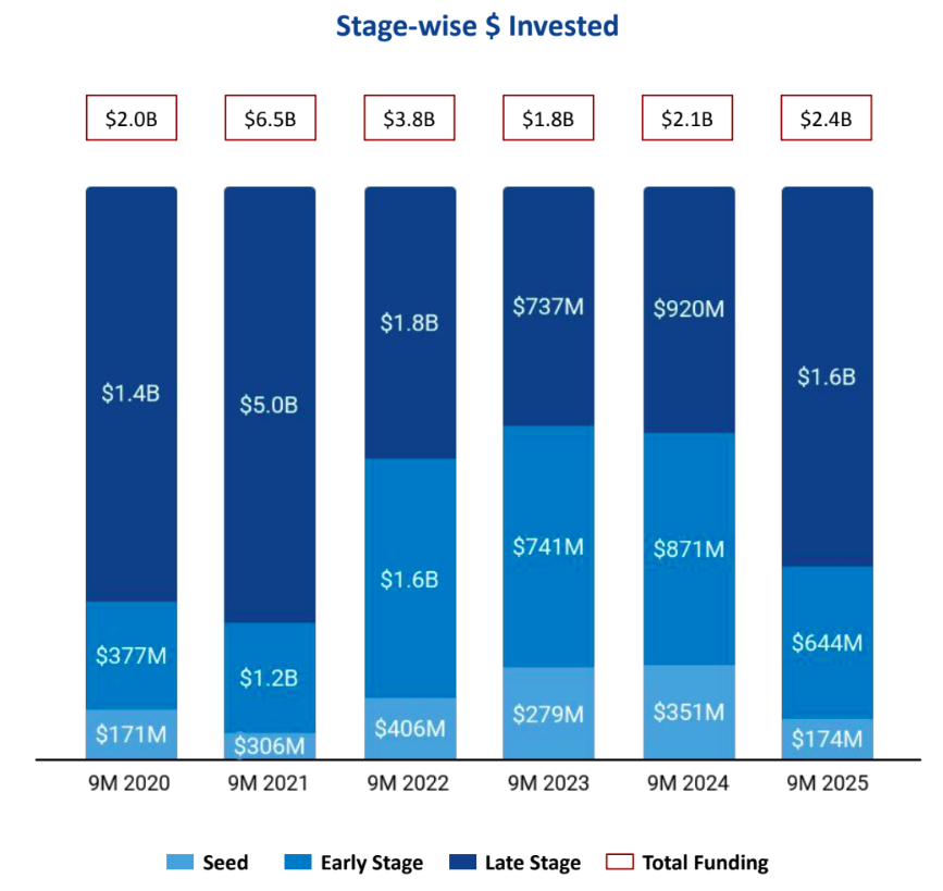 Funding activity across stages in Delhi NCR showed mixed trends in 9M 2025. Seed-stage funding stood at $174M, reflecting a 50% decline from $351M in 9M 2024 and a 38% drop from $279M in 9M 2023. Early-stage investment totaled $644M, marking a 26% decrease compared to $871M in 9M 2024 and a 13% decline from $741M in 9M 2023. In contrast, late-stage funding recorded strong momentum, reaching $1.6B in 9M 2025, a 77% rise from $920M in 9M 2024 and a 121% increase compared to $737M raised in 9M 2023.