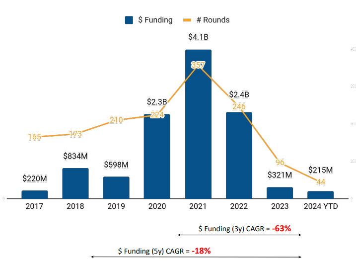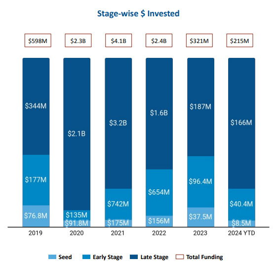 The majority of funding in this space has been seen in late-stage rounds, with a funding peak in 2021 and a sharp decline in 2023, dropping 94% from 2021 and 88% from 2022, with $187M raised. In 2024 YTD, $166M has been raised in Late-stage rounds. Similarly, Early-stage investments also peaked in 2021 and have steadily declined with 2023 witnessing $96.4M raised, an 85% drop from 2022's $654M. So far, in 2024, Early-stage funding totals $40.4M. Seed-stage funding in India peaked in 2021 at $175M but has since declined significantly. Funding for seed-stage rounds dropped to $8.5M in 2024 YTD, marking a 76% decrease from the $156M raised in 2022.