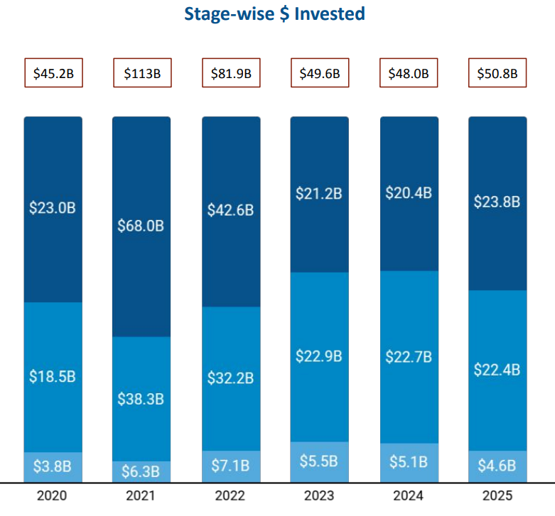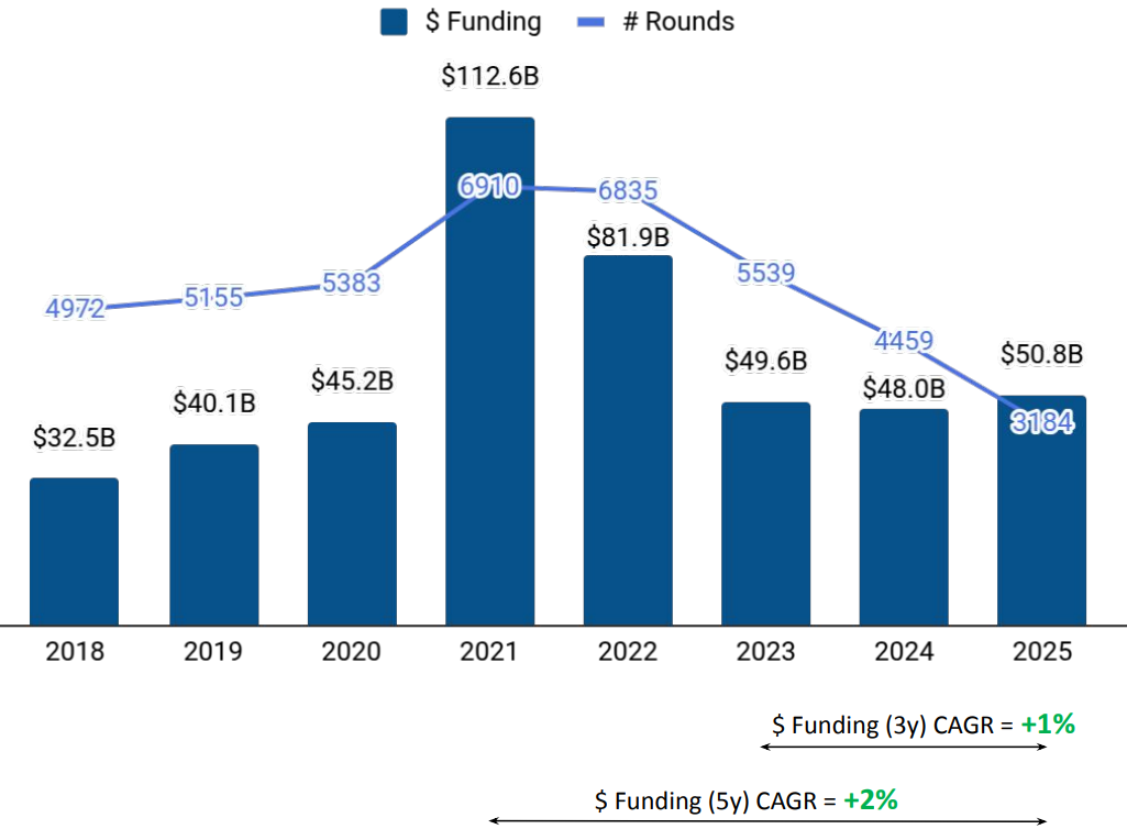 A total of $50.8B was raised by Europe Tech companies in 2025, representing a 6% increase compared to $48B raised in 2024 and a 2% rise compared to $49.6B raised in 2023. Overall funding growth was supported by increased late-stage capital deployment, even as early-stage activity moderated compared to previous years.
