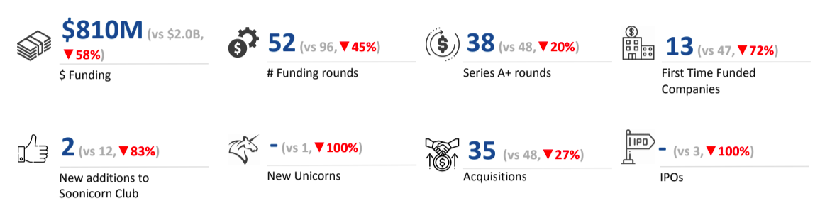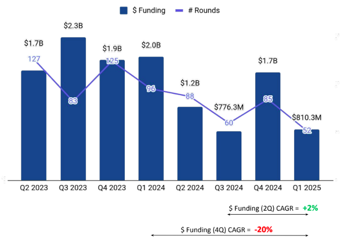 A total of $810M was raised in Q1 2025, a drop of 52% compared to $1.7B raised in Q4 2024, and a drop of 58% compared to $2.0B raised in Q1 2024. The decline reflects a broad pullback across most funding stages and sectors, with only a few segments registering gains.