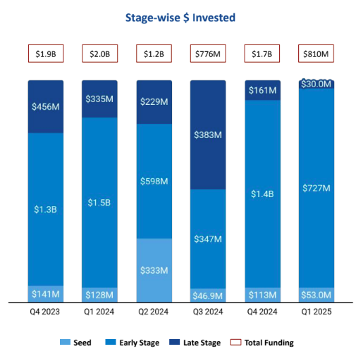 Seed Stage saw a total funding of $53M in Q1 2025, a drop of 53% compared to $113M raised in Q4 2024, and a drop of 59% compared to $128M raised in Q1 2024. Early Stage saw a total funding of $727M in Q1 2025, a drop of 48% compared to $1.4B raised in Q4 2024, and a drop of 52% compared to $1.5B raised in Q1 2024. Late Stage witnessed a total funding of $30M in Q1 2025, a drop of 81% compared to $161M raised in Q4 2024, and a drop of 91% compared to $335M raised in Q1 2024.
