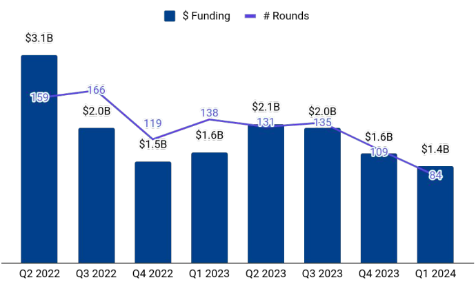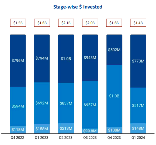 Late-stage investments stood at $773 million in the first quarter of 2024 which is 55% of the total funding in the quarter. Late-stage funding rose 73% compared with $447 million funding in the same period in Q4 2023, and a 24% uptick compared with $622 million raised in the same period in Q1 2023.