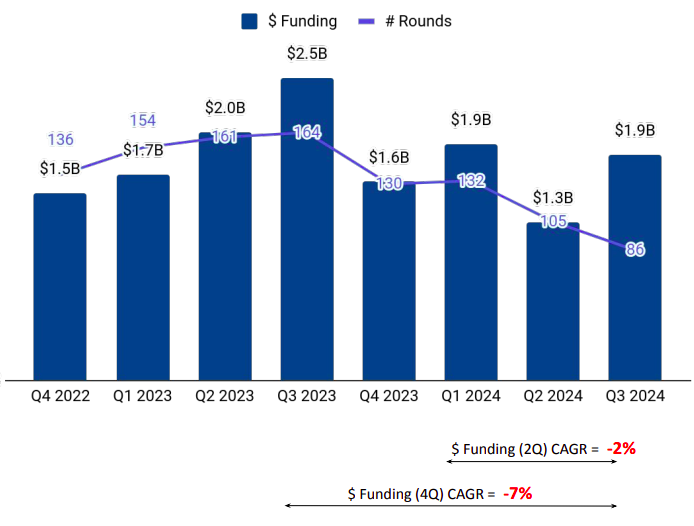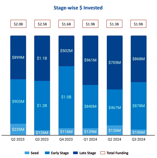 High Tech, Enterprise Applications, and Aerospace, Maritime & Defense Tech were the top-performing sectors in Q3 2024. Funding raised by companies in the High Tech space rose 40% in Q3 2024, compared with the previous quarter. The Enterprise Applications segment witnessed a 31% increase in Q3 2024 compared with Q2 2024. Funding raised by Aerospace, Maritime & Defense Tech companies surged 701% in Q3 2024 compared with Q2 2024.