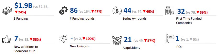 No new unicorns emerged in the third quarter of this year. There was also a sharp decline in the number of acquisitions, which fell to 21 in Q3 2024 from 43 and 49 in Q2 2024 and Q3 2023, respectively. Further, BigRep was the only company to go public in Q3 2024.