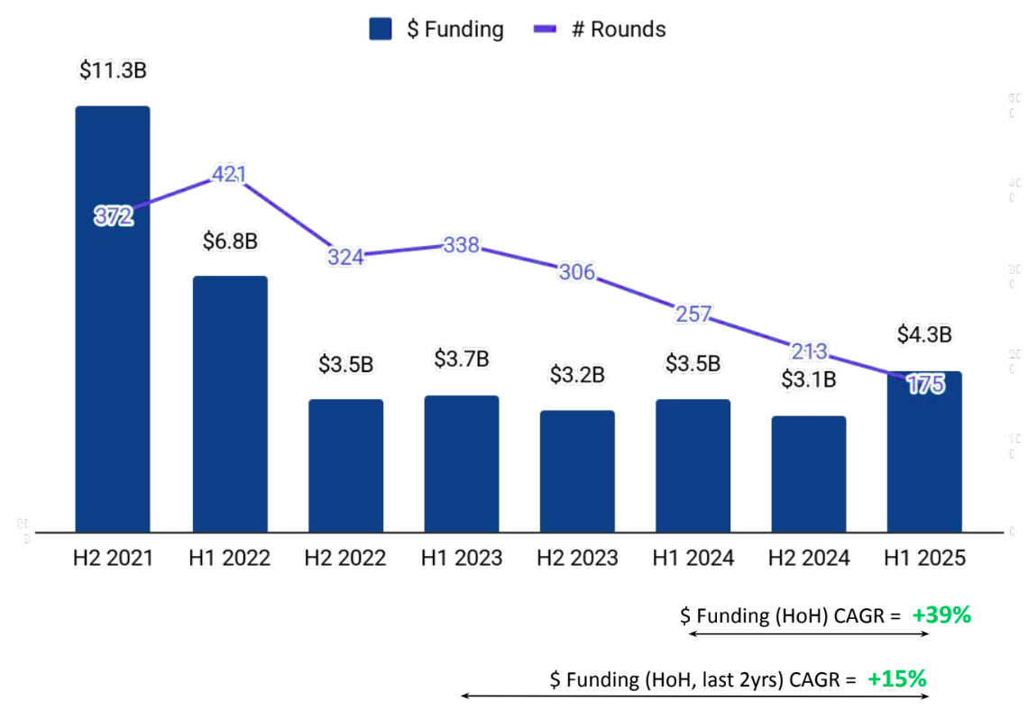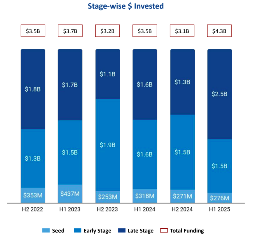 Seed-stage funding totaled $276M in H1 2025, reflecting a 2% increase over the $271M raised in H2 2024, but a 13% decline from the $317M in H1 2024. Early-stage investments reached $1.51B, nearly unchanged from $1.5B in H2 2024 and slightly down from $1.6B in H1 2024. The most notable growth was seen in Late-stage funding, which surged to $2.5B in H1 2025, up 89% from $1.3B in H2 2024 and 54% from $1.6B in H1 2024.