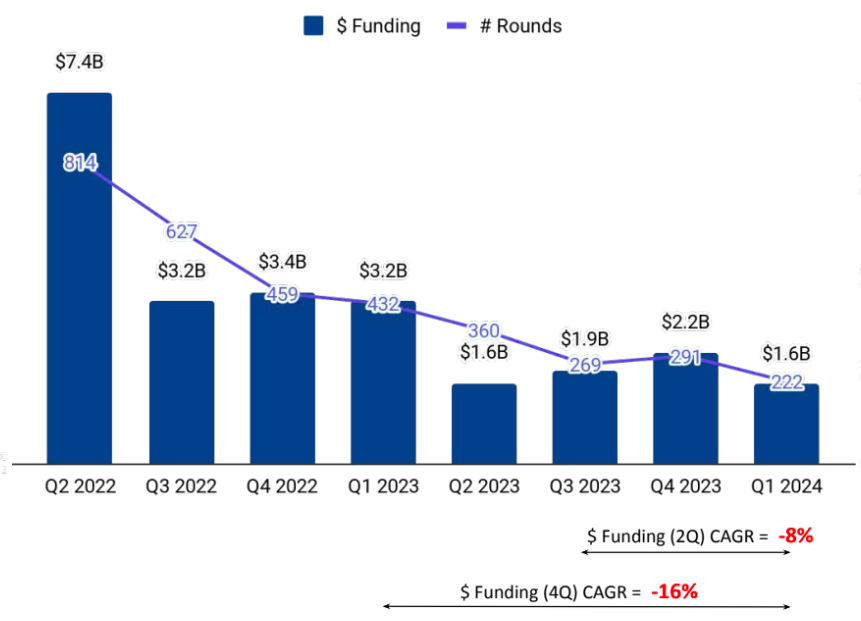 According to the report, India experienced a slowdown in Q1 2024 (until 15th March), with $1.6 billion raised in funding after continuous growth in the previous three quarters of 2023. While these figures are lower compared to the same period in 2021 and 2022, India secured the fourth-highest position globally in terms of funding raised during this period, reflecting the resilience of its entrepreneurial landscape.