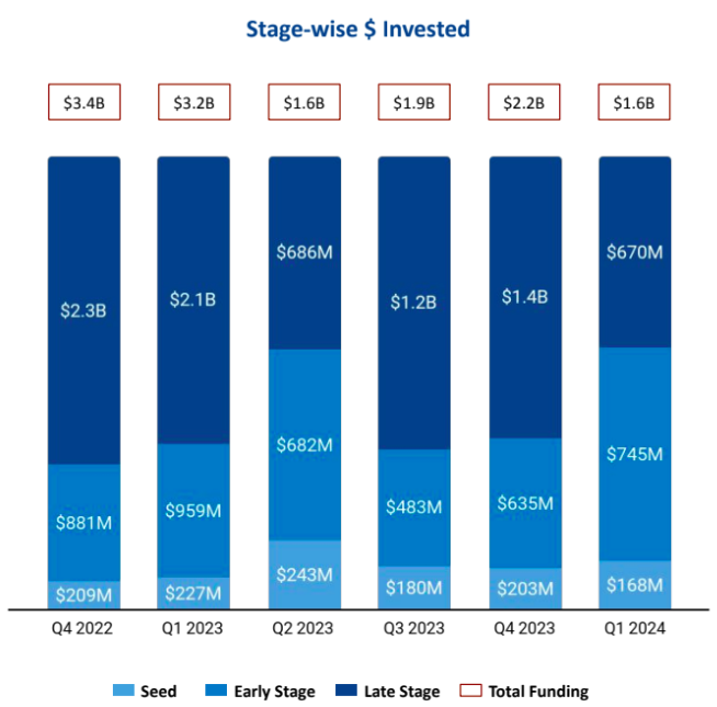Venture Catalysts, We Founder Circle, and Titan Capital led the seed investments in Q1 2024, while Peak XV Partners, Saama Capital, and RTP Global were prominent in early-stage investments. Elev8, Epiq Capital Advisors, and UC-RNT Fund took the lead in the late-stage category this quarter.