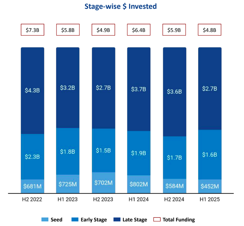 • India’s tech startup ecosystem raised $4.8B in H1 2025, a 25% decline from H1 2024 and 19% from H2 2024