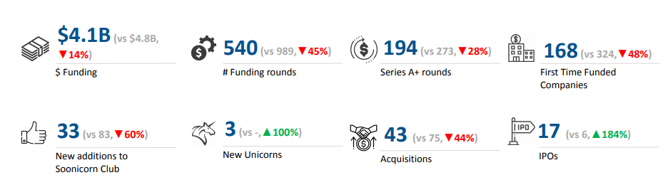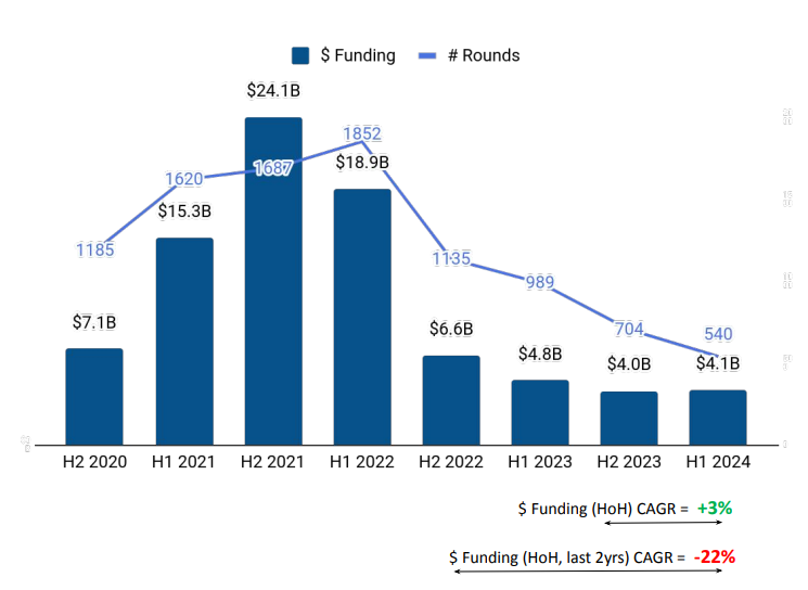 The leading sectors in terms of performance in H1 2024 were Retail, Enterprise Applications, and FinTech. Funding in the Retail sector increased by 32%, reaching $1.63 billion in H1 2024 compared to $1.23 billion in H1 2023. The Enterprise Application sector raised $933 million in H1 2024, a 10% decrease from the $1.04 billion raised in H1 2023. In the FinTech space, funding dropped by 50%, from $1.45 billion in H1 2023 to $726 million in H1 2024.