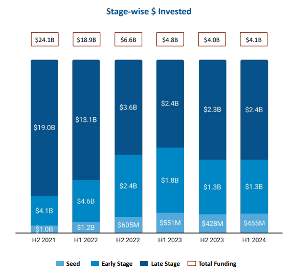 The funding landscape across different stages showcased varied trends: Seed-stage funding increased to $455 million, up by 6.5% from H2 2023 but down 17.3% from H1 2023. Early-stage startups maintained a steady funding amount of $1.3 billion, consistent with H2 2023 but 28% lower than H1 2023. Late-stage funding rose to $2.4 billion, marking a 3.8% increase from H2 2023, although it saw a slight 1.3% drop compared to H1 2023.