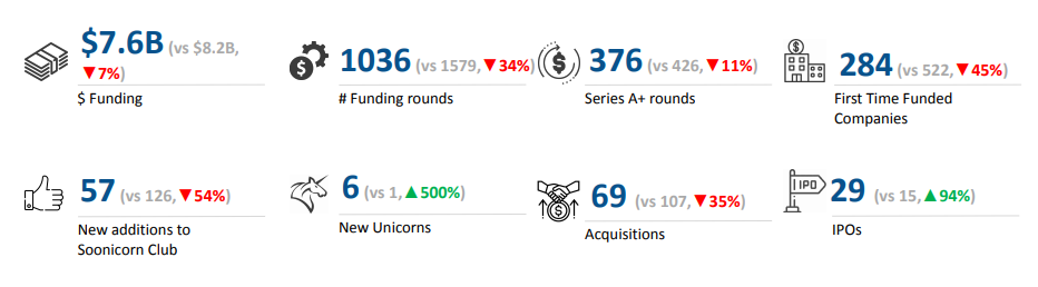India saw six new unicorns marking a 500% increase compared to just one in 2023. IPO activity also surged, with 29 tech companies going public, up from 15 in the same period last year. Notable IPOs include Aeron Composite, Firstcry, Unicommerce, Ola Electric, and RNFI Services. However, acquisitions declined by 36%, with 69 deals in 2024 compared to 107 in 2023. Significant acquisitions include Kitchens-at by Finnest for $160M and PingSafe by SentinelOne for $100M.