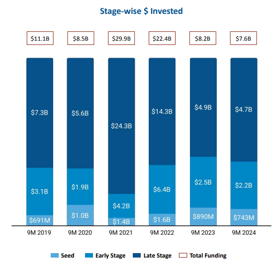 The India Tech ecosystem saw 12 funding rounds exceeding $100M in 2024 YTD, with Zepto raising $1B across two consecutive rounds, making it the only company to secure over $500M this year. In comparison, there were 16 $100M+ rounds in the first nine months of 2023, indicating a slight slowdown in mega funding rounds this year. Other notable startups, including Flipkart, DMI Finance, Apollo 24|7, Meesho, API Holdings, and Rapido, have each raised over $200M in 2024.