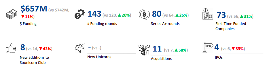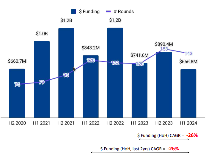 The Japanese tech startup ecosystem ranked 15th globally in terms of funding, raising $657 million in the first half of 2024, an 11.4% drop from the $742 million raised in H1 2023. Seed-stage investments stood at $121 million in H1 2024, a surge of 138.7% from the $50.7 million raised in H1 2023. This space witnessed early-stage funding of $314 million in H1 2024, a drop of 18.2% from the $384 million raised in H1 2023. Late-stage funding fell 27.4% to $223 million in H1 2024 from the $307 million raised in the first half of 2023.