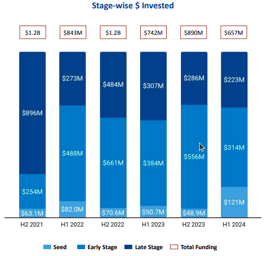 High Tech, Enterprise Applications and Retail were the top-performing sectors in H1 2024. The High Tech space witnessed a 7% drop in funding, from $319 million in H1 2023 to $374 million in H1 2024. Funding in the Enterprise Applications segment stood at $236 million in H1 2024, 26% lower than the $322 million raised in H1 2024. The Retail segment attracted investments worth $126 million in H1 2024, a 101% spike from $62.5 million raised in H1 2023.